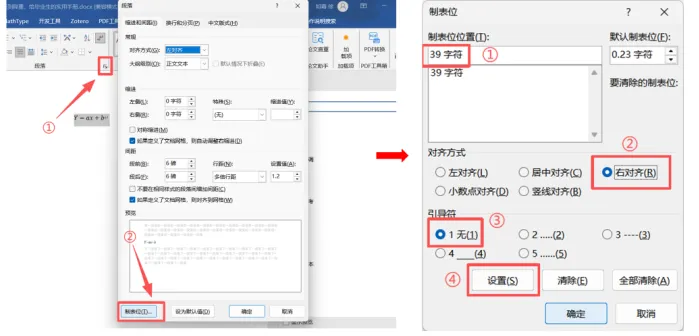 论文公式序号常出现高低不齐、无法右对齐的问题。选中公式行,点击段落右下角小箭头,【制表位-38字符-右对齐-设置-确定】,公式末尾按Tab键,输入编号(1),即可单独右对齐公式序号。