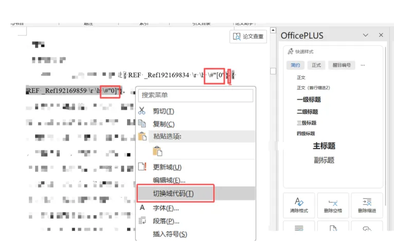 论文有时需要引用多篇不同参考文献,需要将引用格式改为[1-3]。选中引用编号右键【切换域代码】,输入\#”[0″或\#”0]”以及中间连接符“-”或“,”,右键【更新域】即可实现。