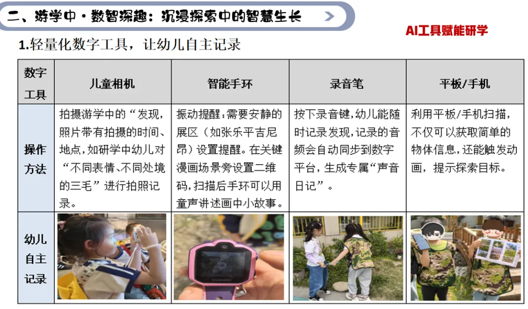 朱老师在游学中将AI多维度赋能:游学前,借AI建数字素材、个性化地图,精准捕捉兴趣;游戏中用电子手表、AI、智能手环保障安全、触发互动,创造深化体验;游戏后,电子档案整合数据,个性化评价助力幼儿从“激趣——延趣的智慧游戏新样态。
