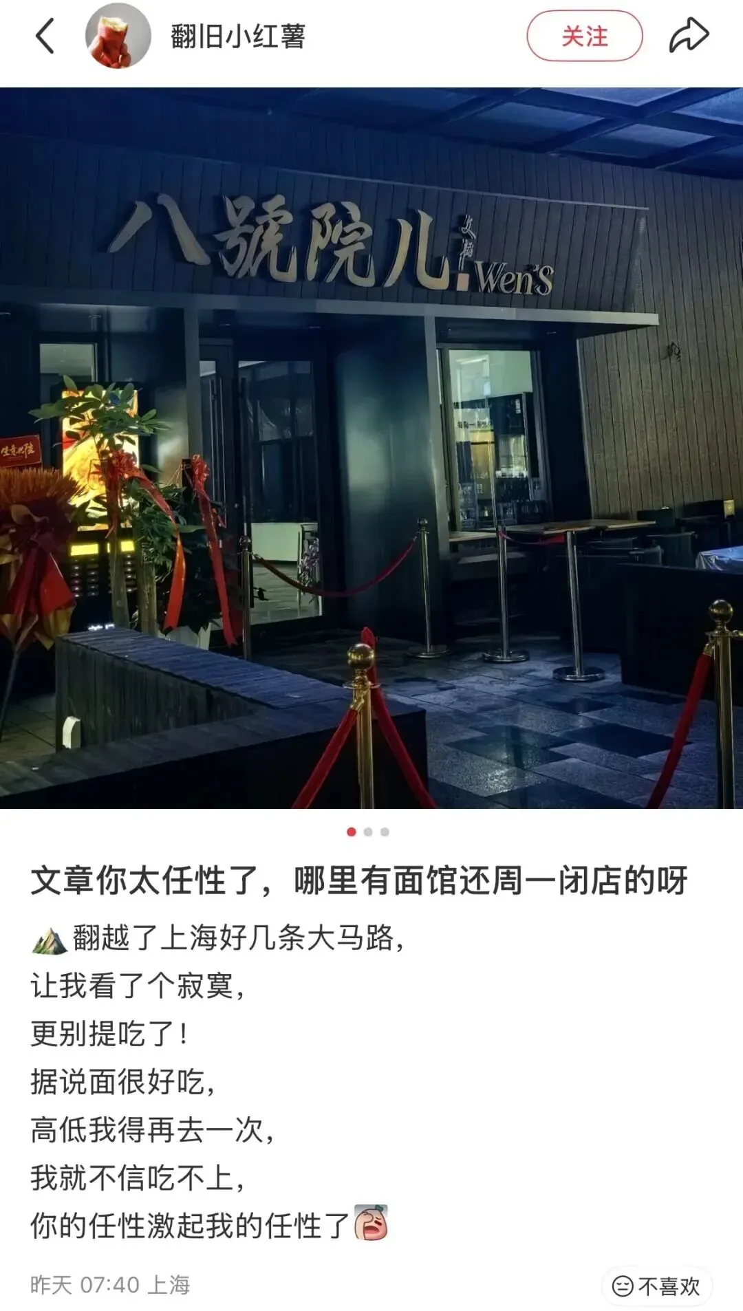 这次不是“复出失利”的消息,而是他在上海开了家面馆,名叫“八号院儿”。