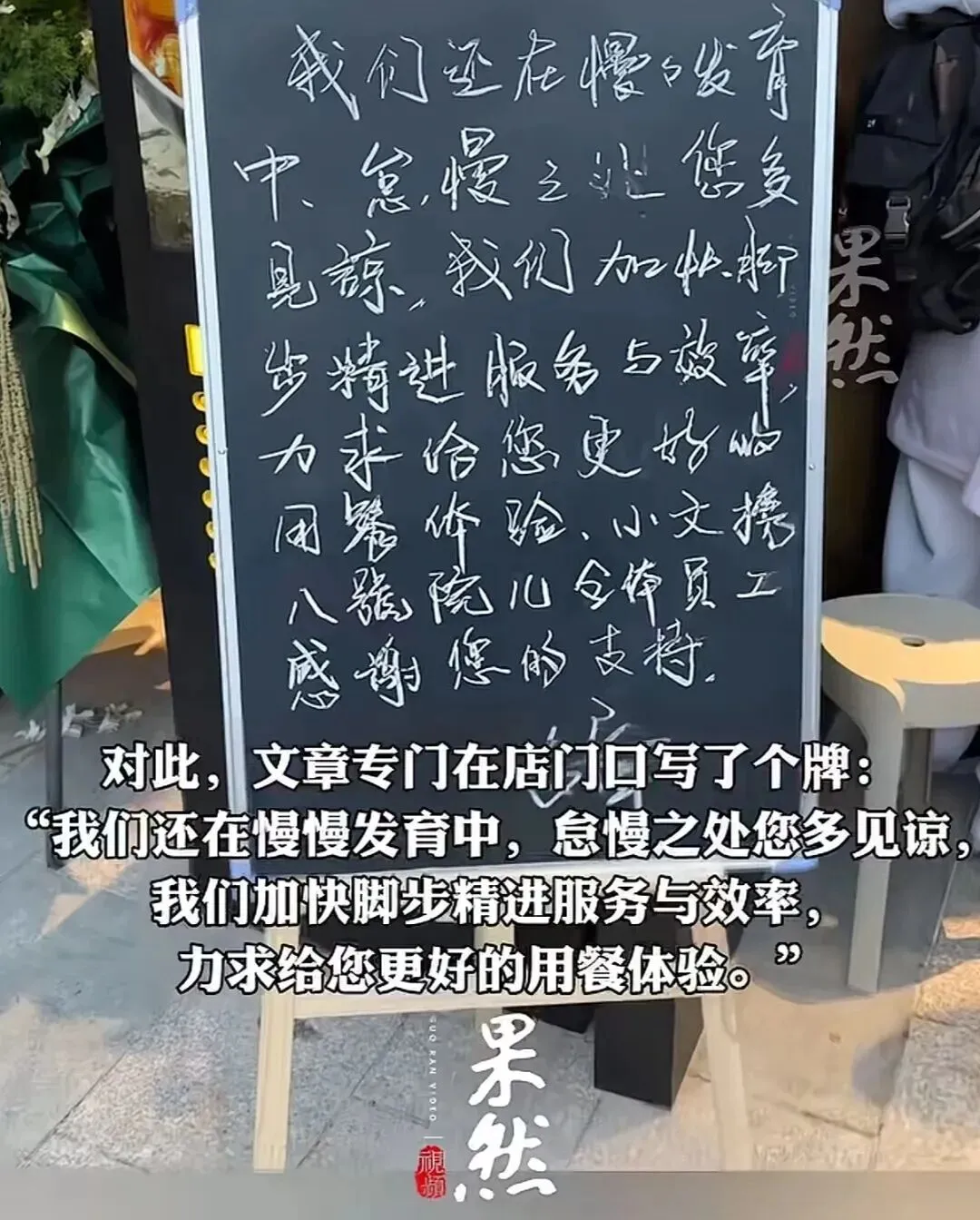 “我们还在慢慢发育中,怠慢之处您多见谅,我们加快脚步精进服务与效率,力求给您更好的用餐体验。小文携八号院儿全体员工感谢您的支持。”