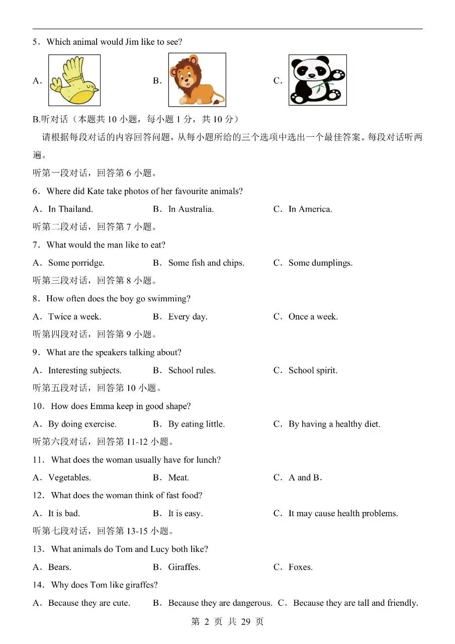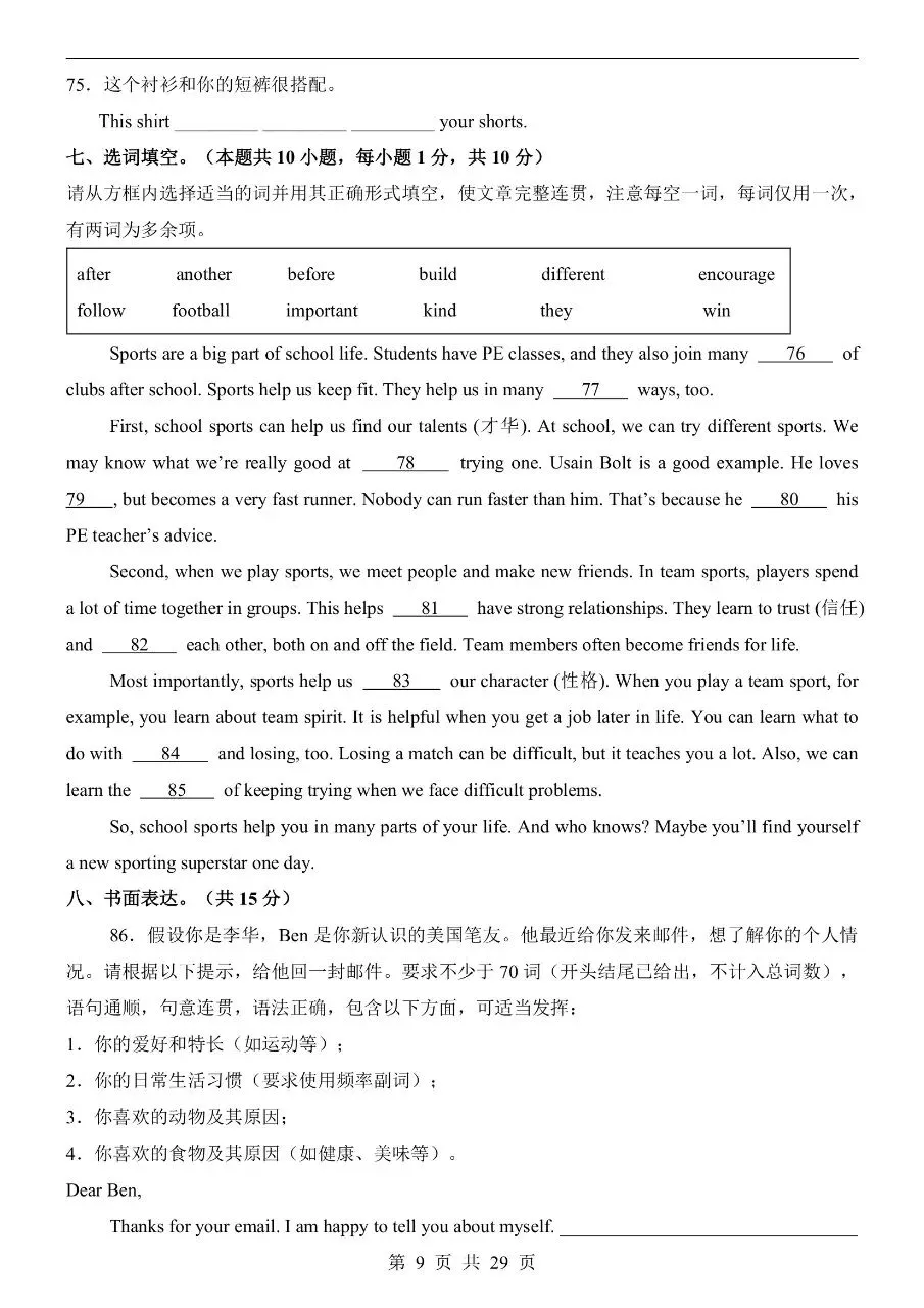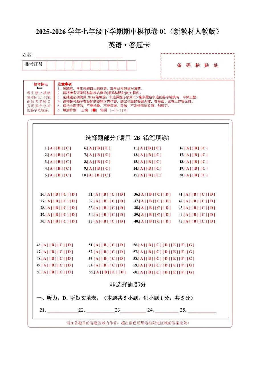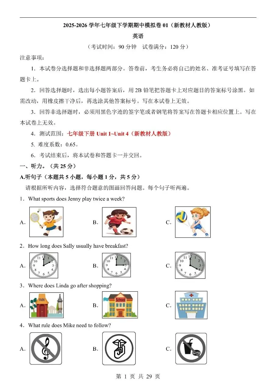 七年级下册人教版英语期中模拟卷含答案可打印