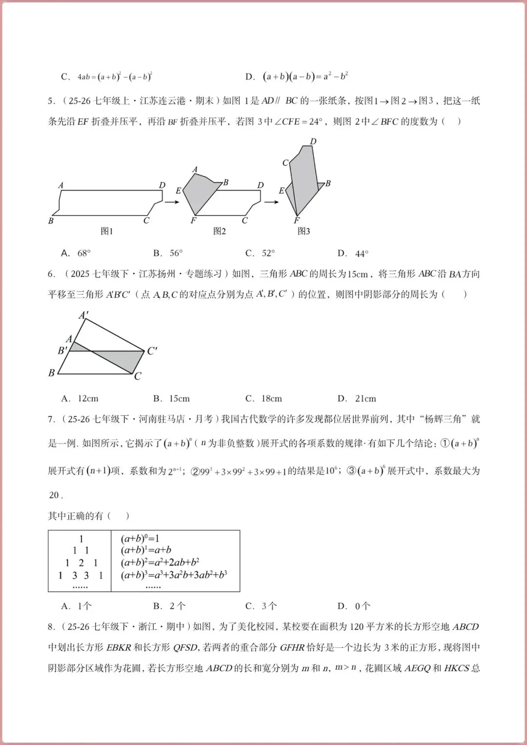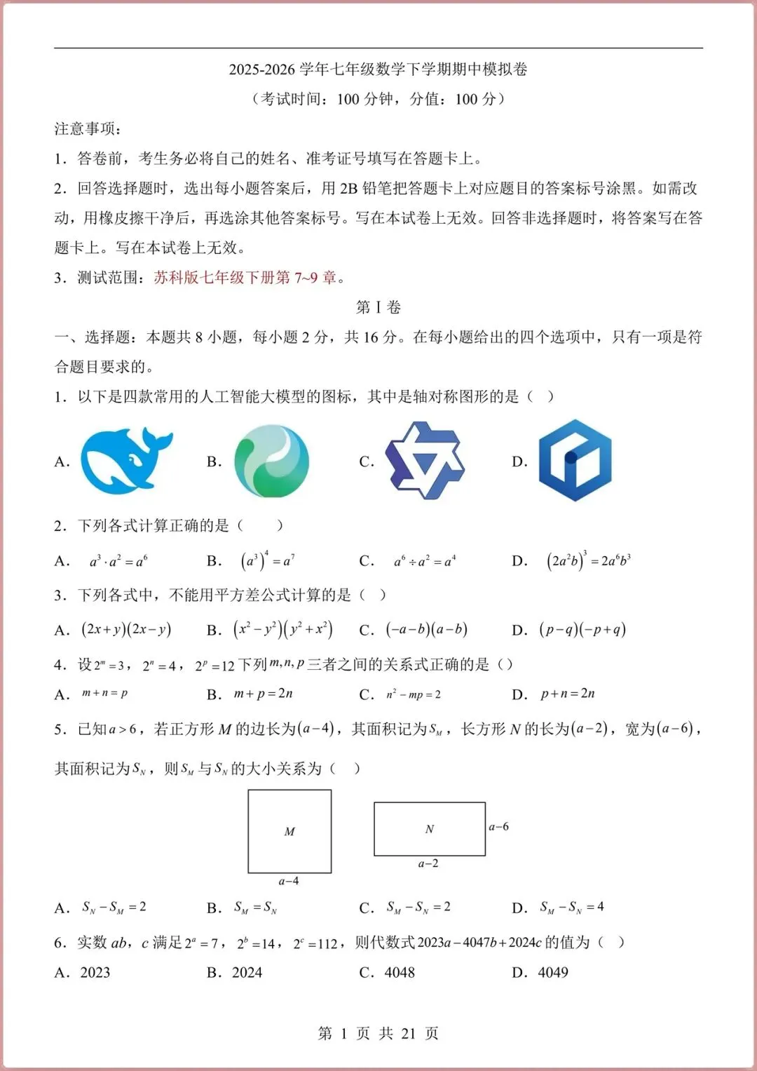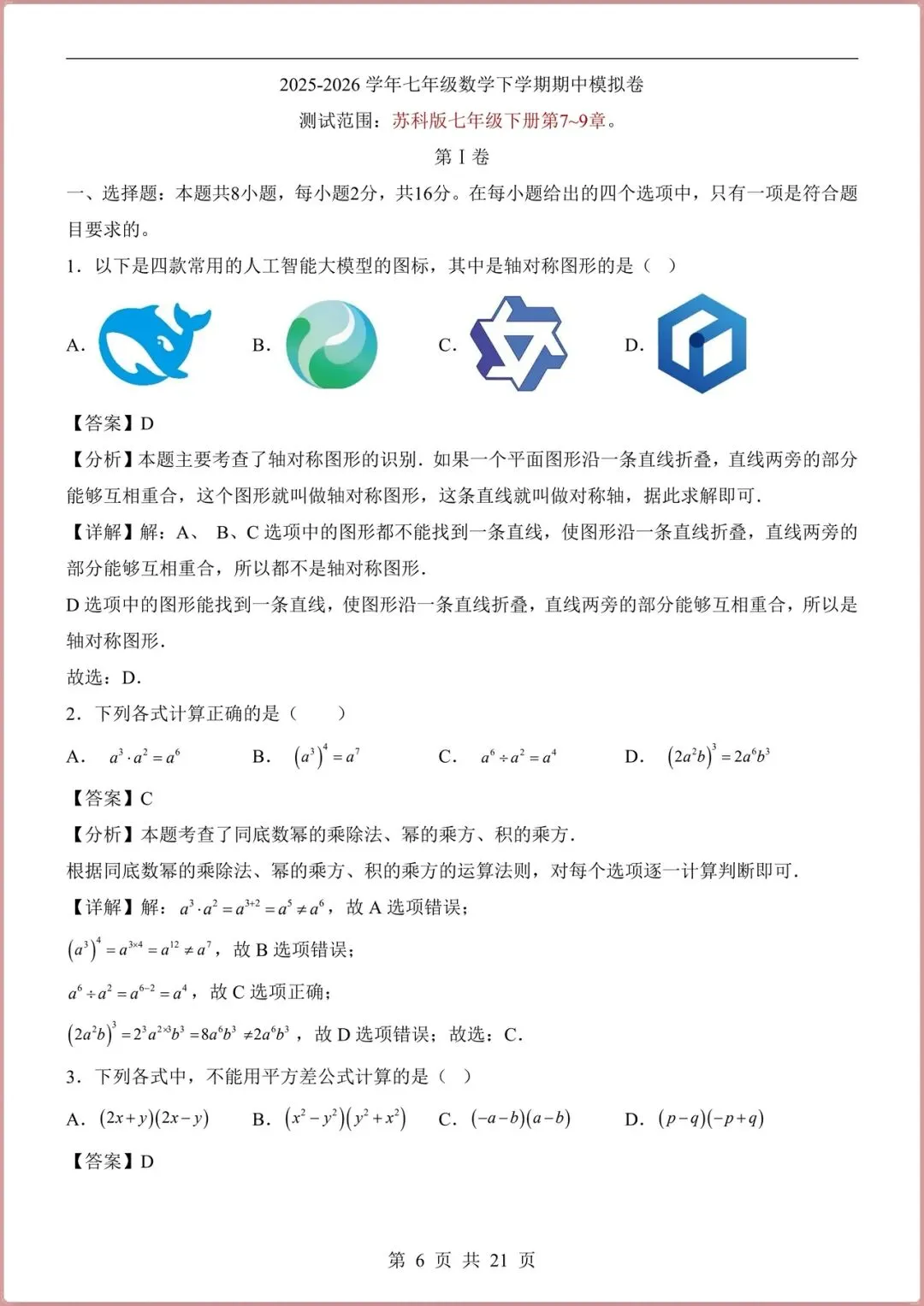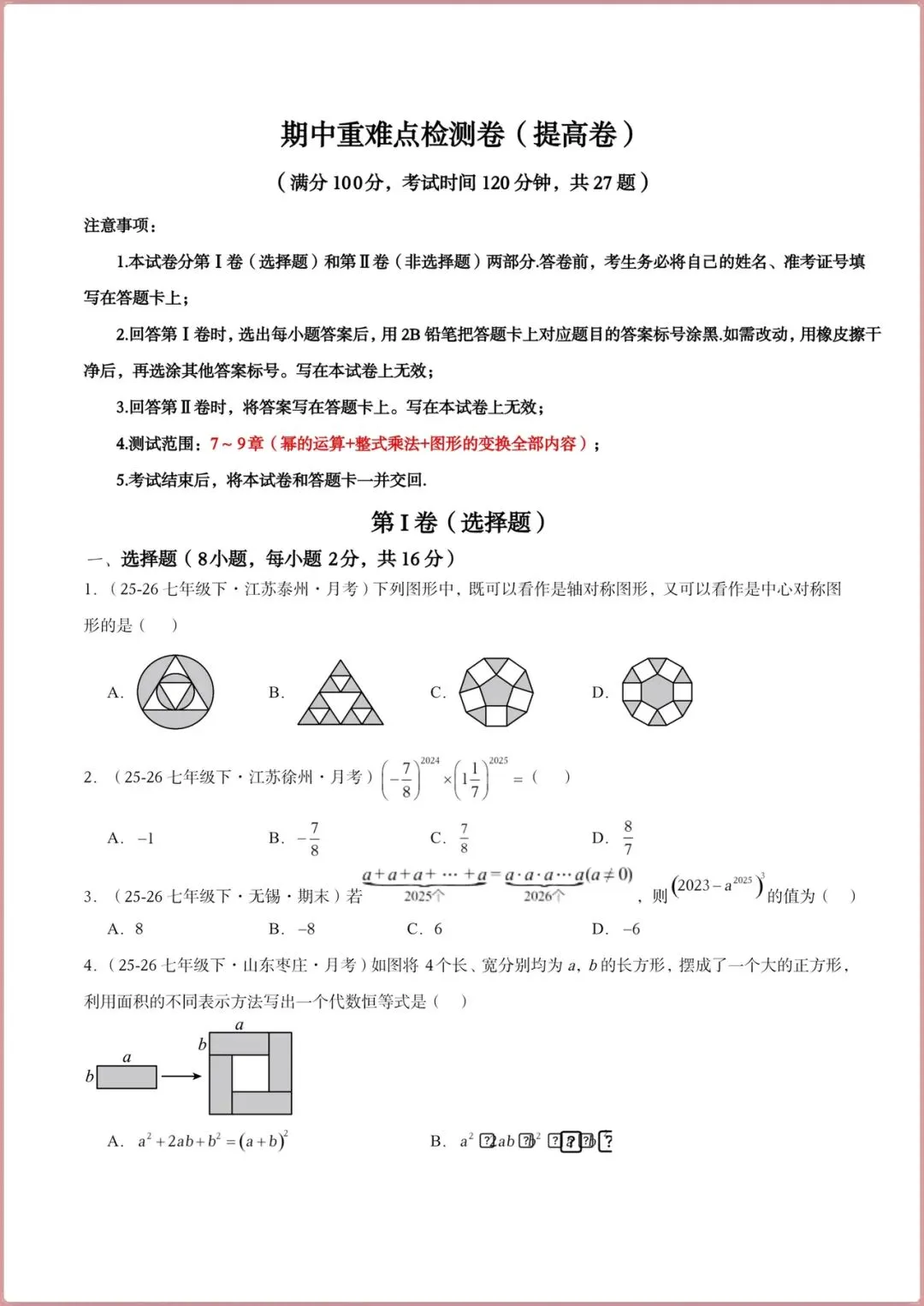 2026新(苏科版)七年级下册数学期中试卷+解析(拔尖+培优卷)多套,电子版可打印!