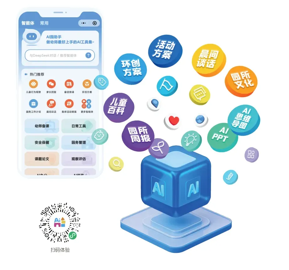 结语:在“AI for学校教育”的时代背景下,人工智能正在为学前教育注入新的活力与可能。AI园助手以技术为桥,以专业为基,既帮助幼师减负增效、实现专业成长,也助力园所规范管理、高效迎检,响应国家教育数字化战略要求,推动学前教育高质量发展。