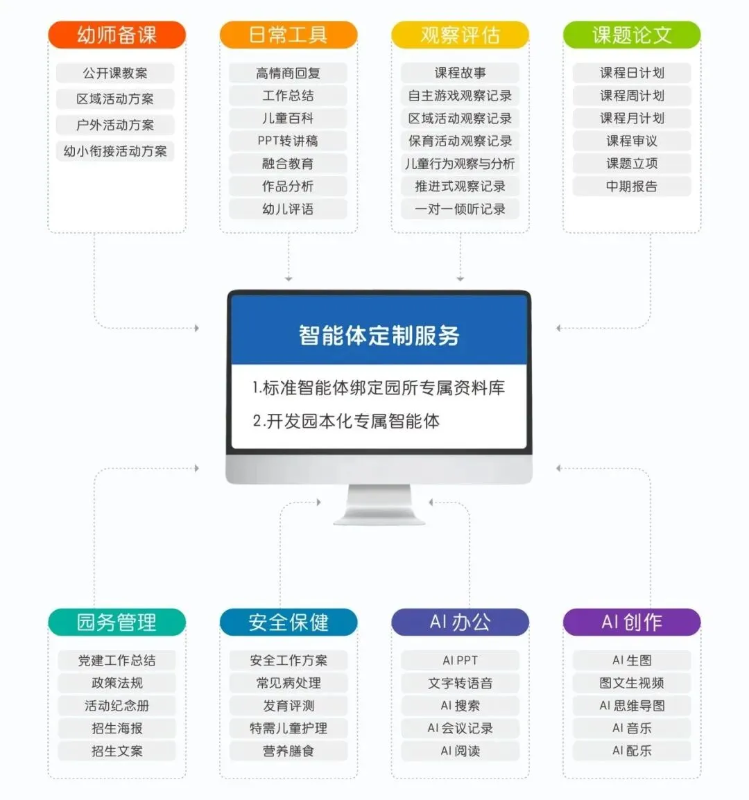 智能体定制服务:标准智能体绑定园所专属资料库,同时可开发园本化专属智能体,适配不同园所的特色需求,让AI工具真正为园所量身定制。
