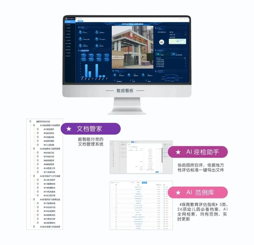 AI 文档管家+AI 迎检助手+AI 范例库:自动识别2000+文件类型,实现智能分类归档;云端双备份,文件历史版本永久追溯,再也不用怕档案丢失;迎检自检系统,对照评估指标智能查漏,让园所评级迎检更轻松,园长、幼师少操心。
