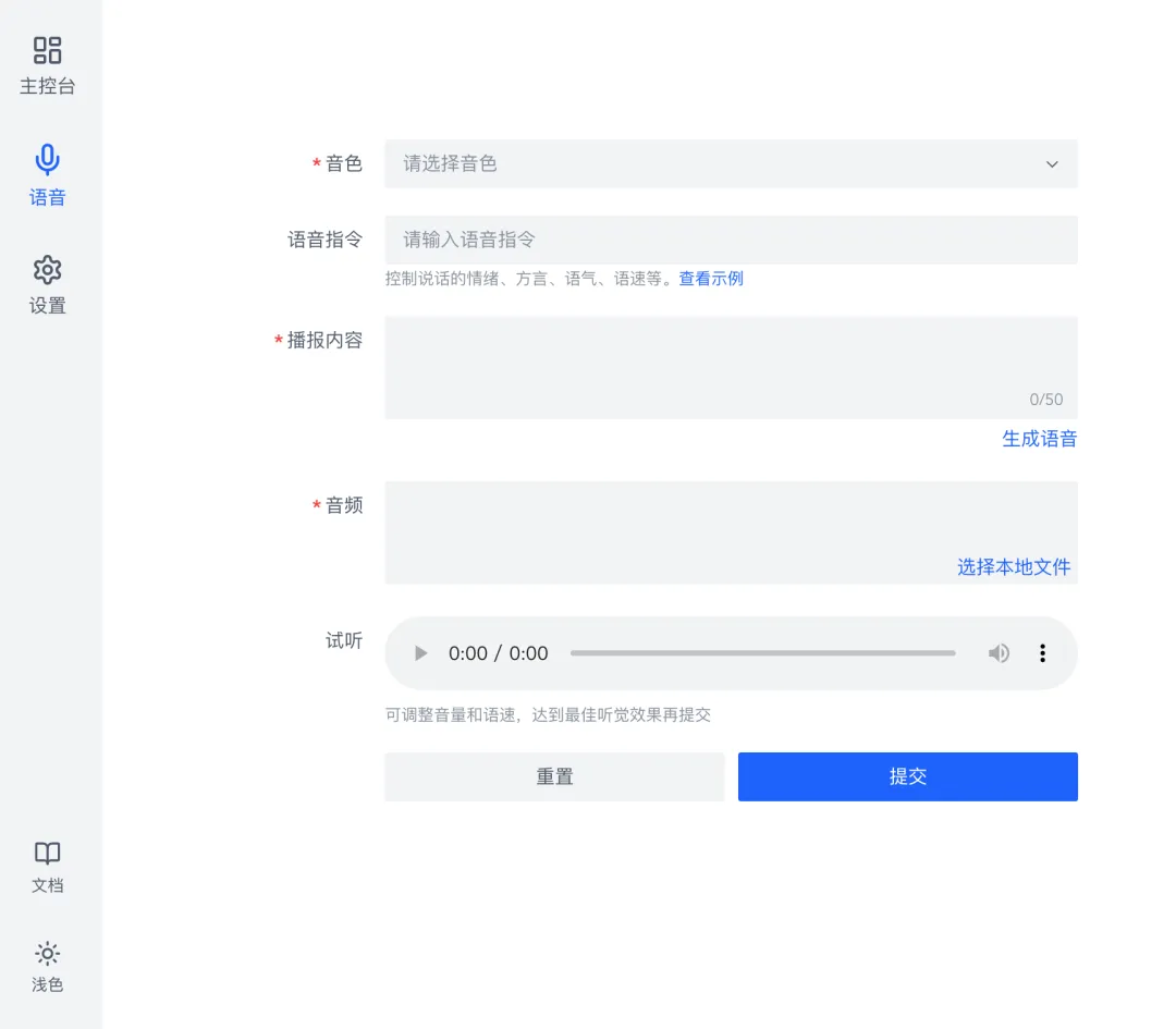 内容与文件双模式:既可以直接输入播报内容,一键生成语音;也能上传本地文件快速转换,适配不同场景的内容需求。生成后支持直接试听,调整音量和语速,确认效果满意后再保存,确保直播时播放的每一句语音都适配直播间氛围。