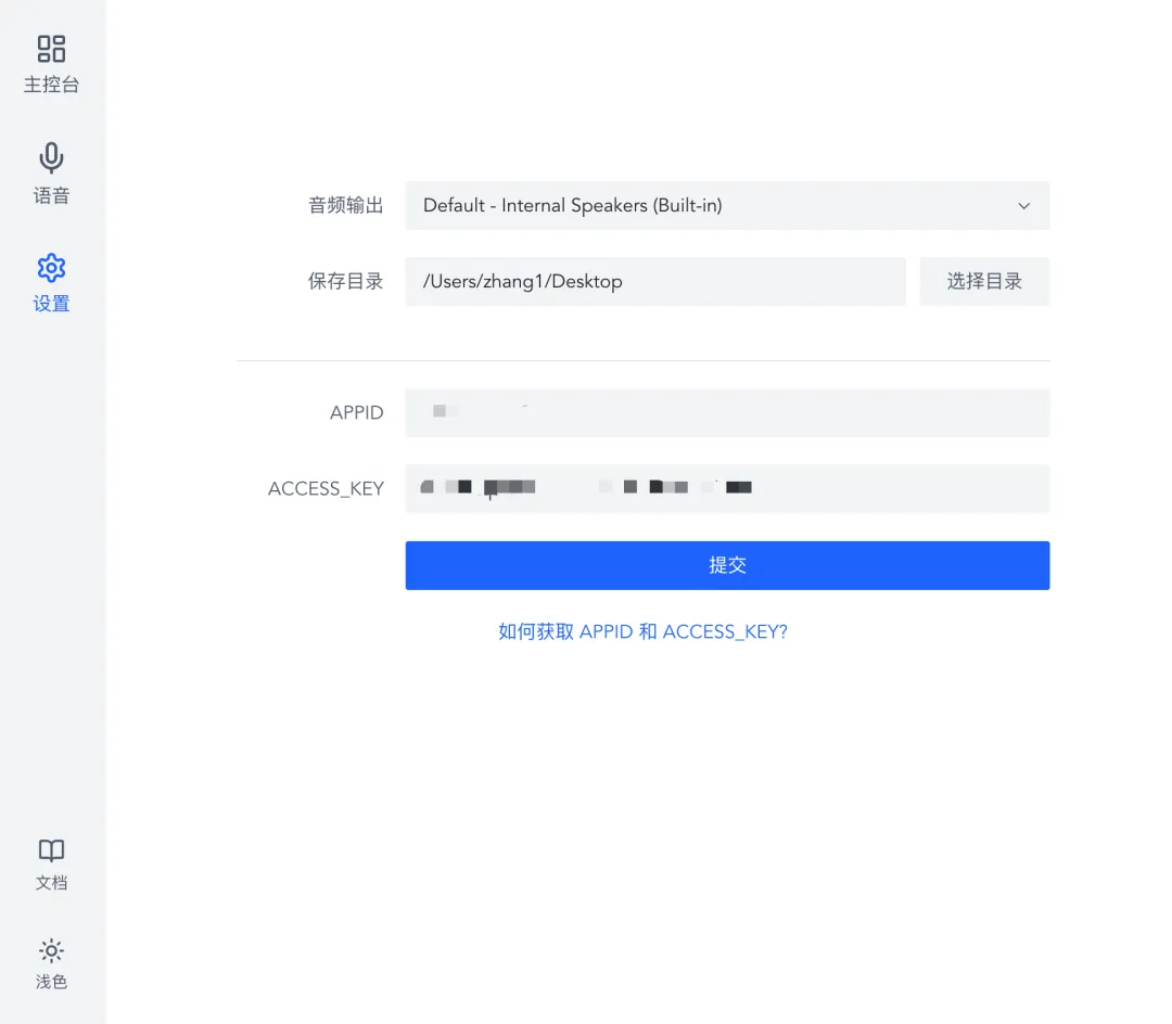 API配置:填入对应的APPID和ACCESS_KEY,完成AI语音服务的授权对接,软件内还附带了获取密钥的指引链接,新手也能轻松完成配置,为后续语音生成打好基础。