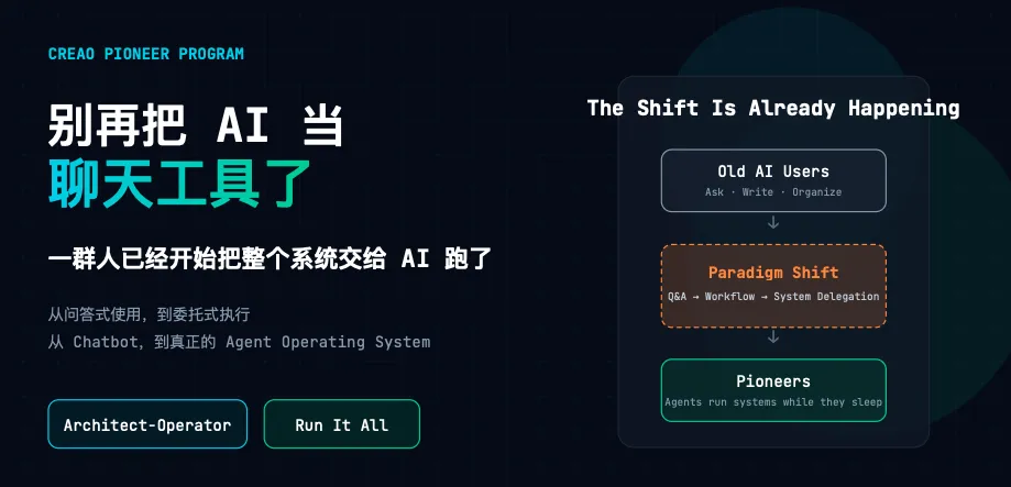CREAO 要找的,不只是“用过 AI 的人”。而是愿意成为Agent 时代示范者、教育者、扩散者、共建者的人。