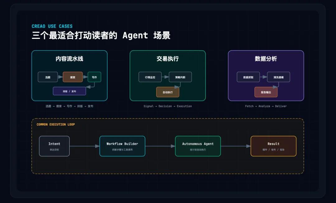 用 CREAO 做出真实 Agent。比如自动化内容流水线、交易策略执行、数据分析流程,真正跑起来,真正展示结果。