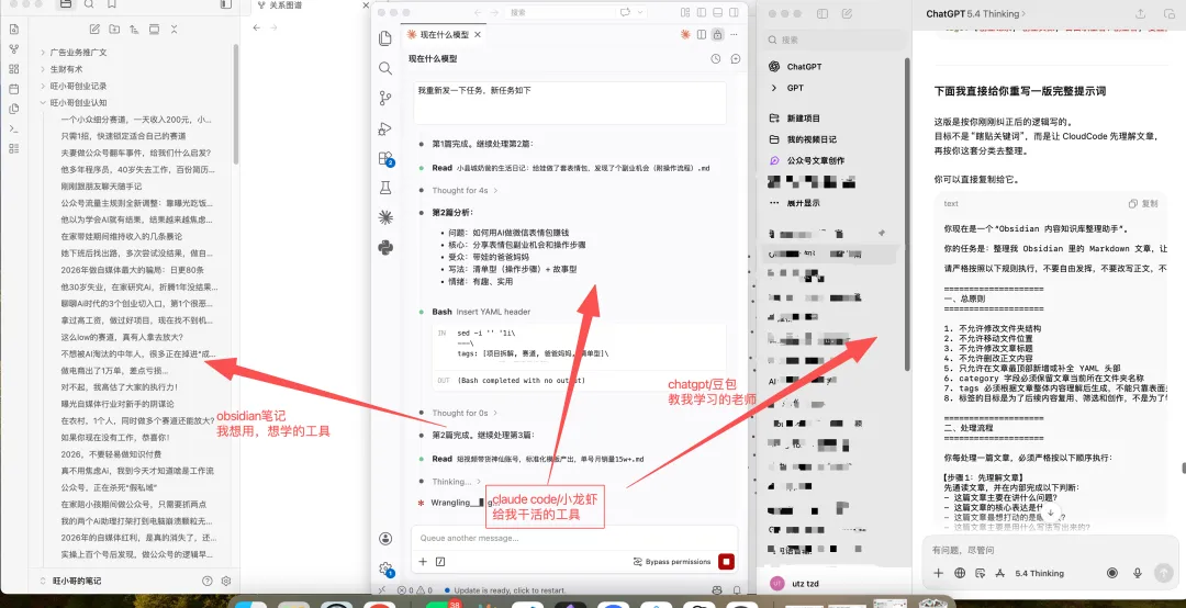 他常用的工具是:Obsidian+Claude,这已经变成了他的工作台,以前打开电脑,他第一件事可能是看飞书,看微信,看备忘录