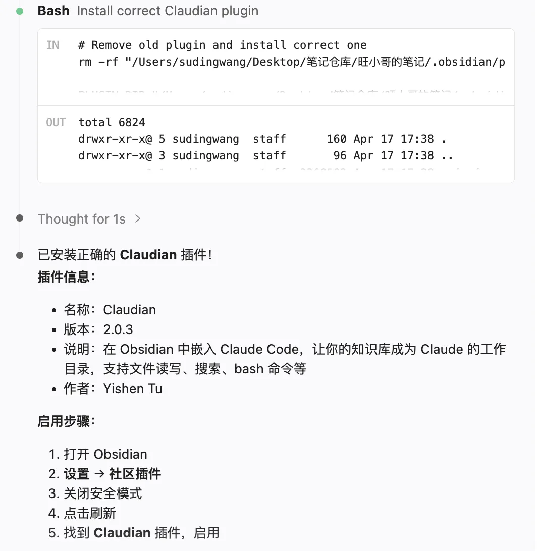 我就给claude code说:“去,给我的obsidian安装个claude code的内置插件”,claude code帮我哐哐哐安装完了