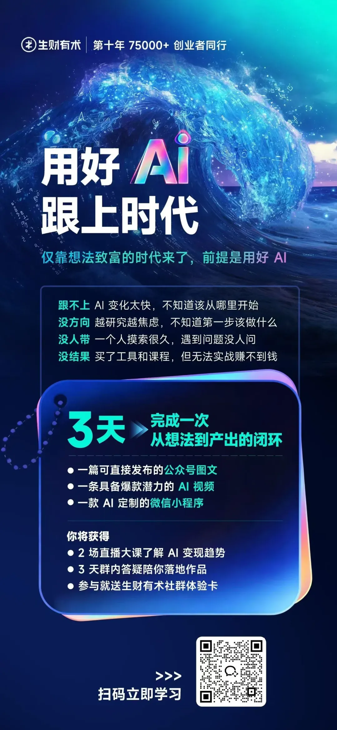 如果你对Ai落地感兴趣,我送给你一张生财有术社群的3天免费体验卡,周一正好还有一场Ai实操体验营,在体验营期间纪钟老师会带大家实操几个 Ai落地的小闭环,并给大家深入介绍生财有术社群