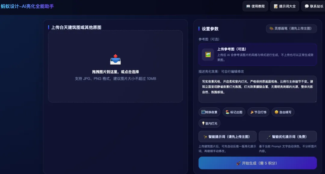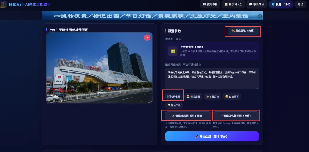 转换夜景:支持自然语言输入提示词,可自由续写、修改,还能点击智能优化提示词,AI自动润色文字,转为贴近专业亮化设计的规范语言,让出图更精准、更符合行业标准。
