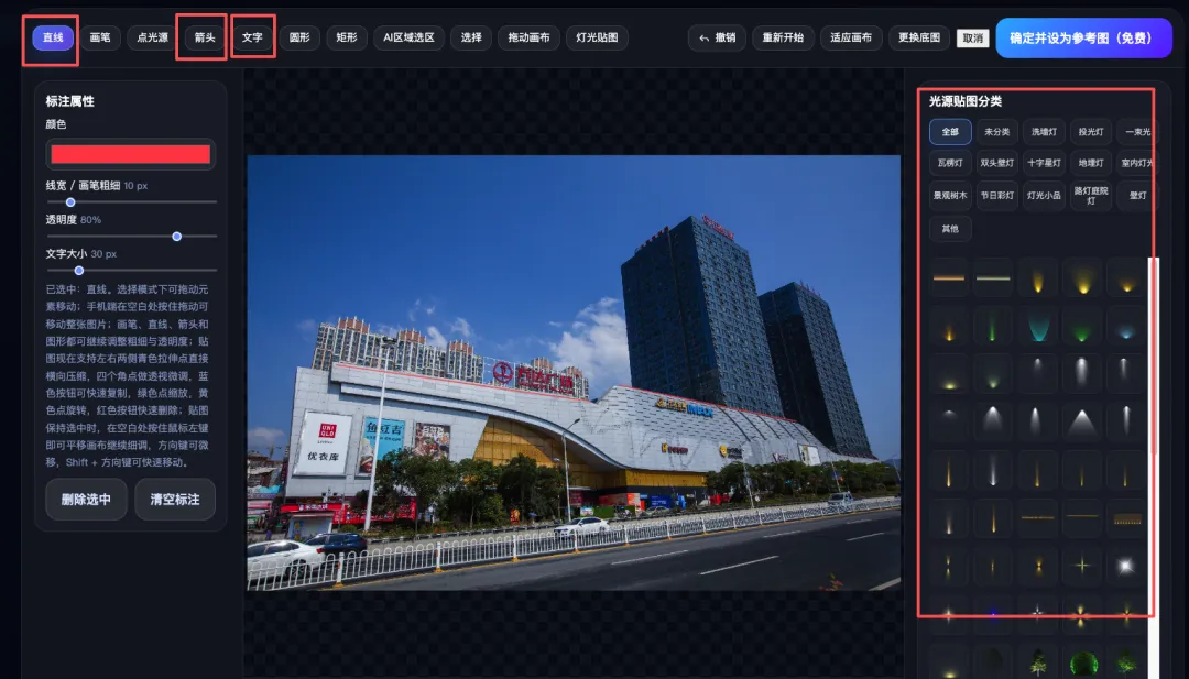 灵感画笔:双重便捷操作,既能自由编辑图片、添加灯光标记、定点出图;也能自主标记线条灯、洗墙灯、投光灯、节日灯、灯光小品、庭院灯等,AI精准识别标记位置,定点定向出图,完全贴合你的设计要求,专业性拉满。