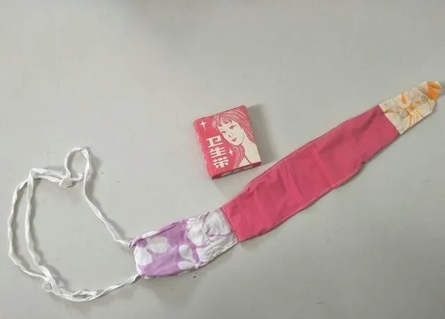 这条长布条叫月经带,女同志每月的必需品,两头细绳可以系在腰间,里头夹个姨妈巾就能防跑偏,八十年代末才有纸质卫生巾,这玩意就慢慢退下来了,妈妈总说,那会儿弄得不仔细就得手洗,冬天更难熬,洗不干净会捱骂,家里女眷都懂,这东西现在小姑娘见了,八成叫不上名字。