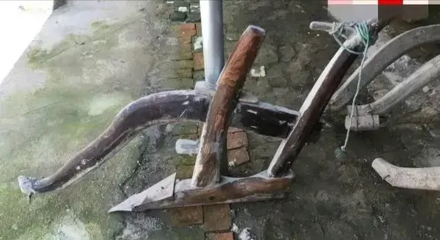 土黄色那根长木架叫耢,播种后压地的农家伙,人站后头,牛走前头,两边拴根旧麻绳,一溜烟拉着过田地,耢底扎满藤条,用来把土面抹平,还能让种子和土紧贴着,爷爷说耢压得匀,苗才长得齐,别看这小木头疙瘩不起眼,没有它,地里全是窝窝坑坑,牛耕人扶,真是累人,现在全靠机械,耢也跟着退出了地头。