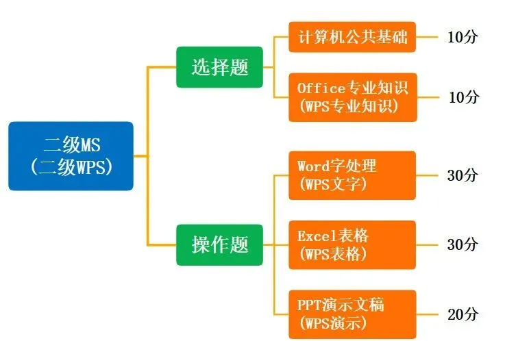 二级MS和二级WPS都是考选择题+操作题,选择题20题20分,操作题1个Word(文字)30分,1个Excel(表格)30分,1个PPT(演示)20分。