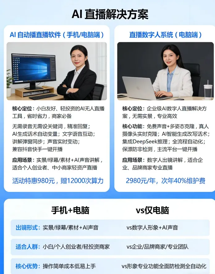 先给大家一句话总结:个人 / 小店、预算少、要手机 + 电脑双端、24 小时轻量无人播,选智享 AI 直播三代;企业 / 品牌、要虚拟形象、做 IP、高客单专业直播,选智享数字人。