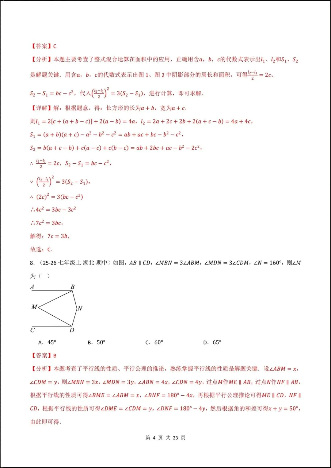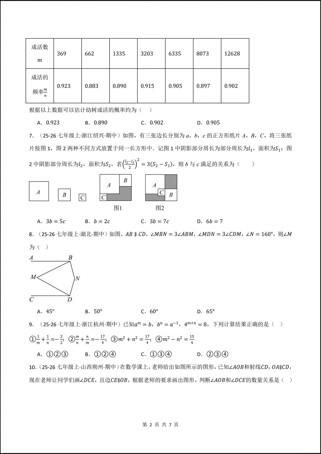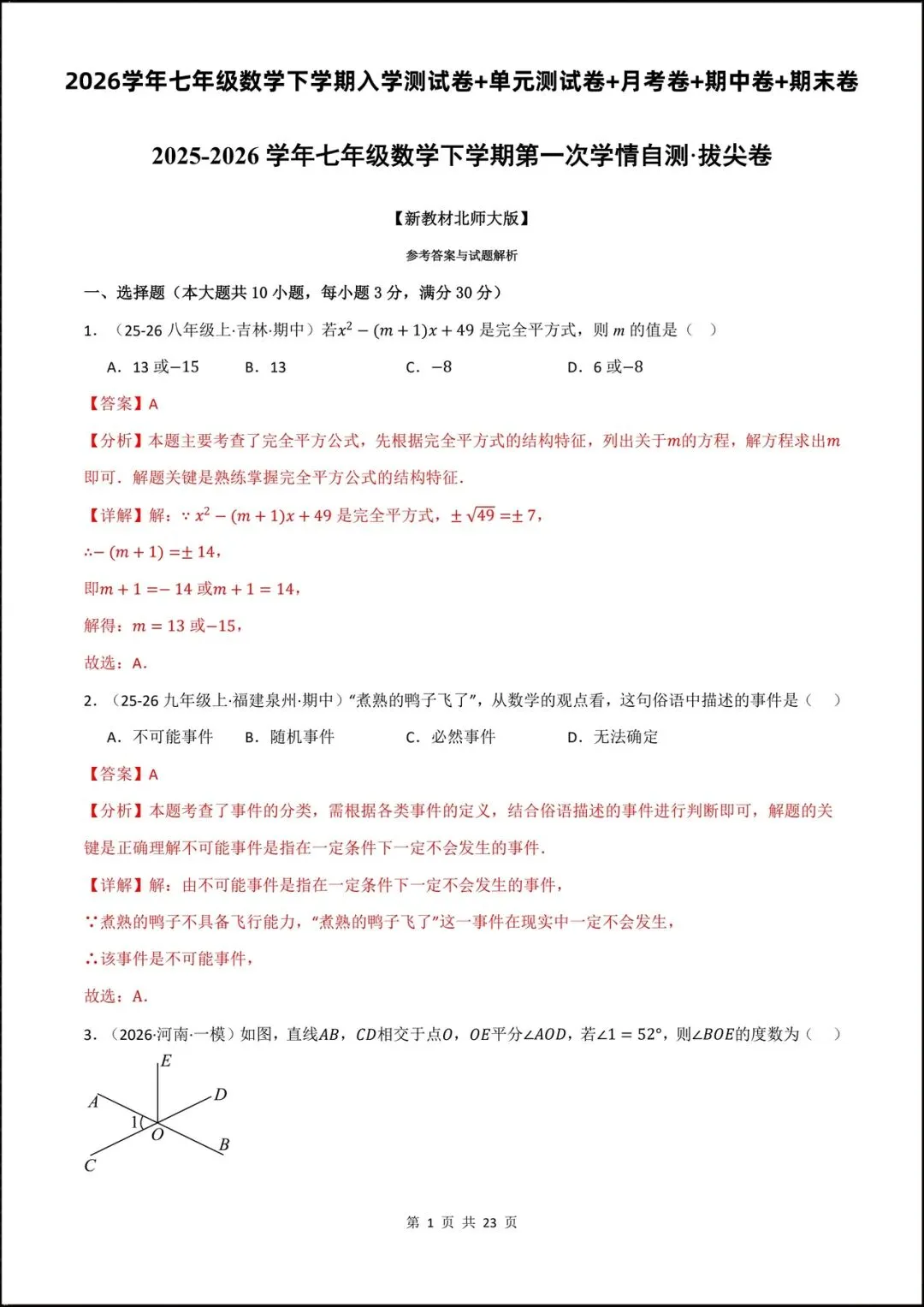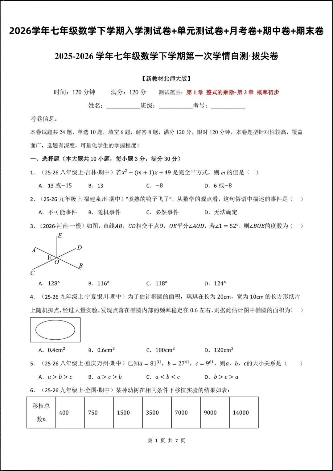 2026新北师大版七年级下册数学试卷(各单元测试卷+月考卷+期中卷+期末卷整合)完整可打印!