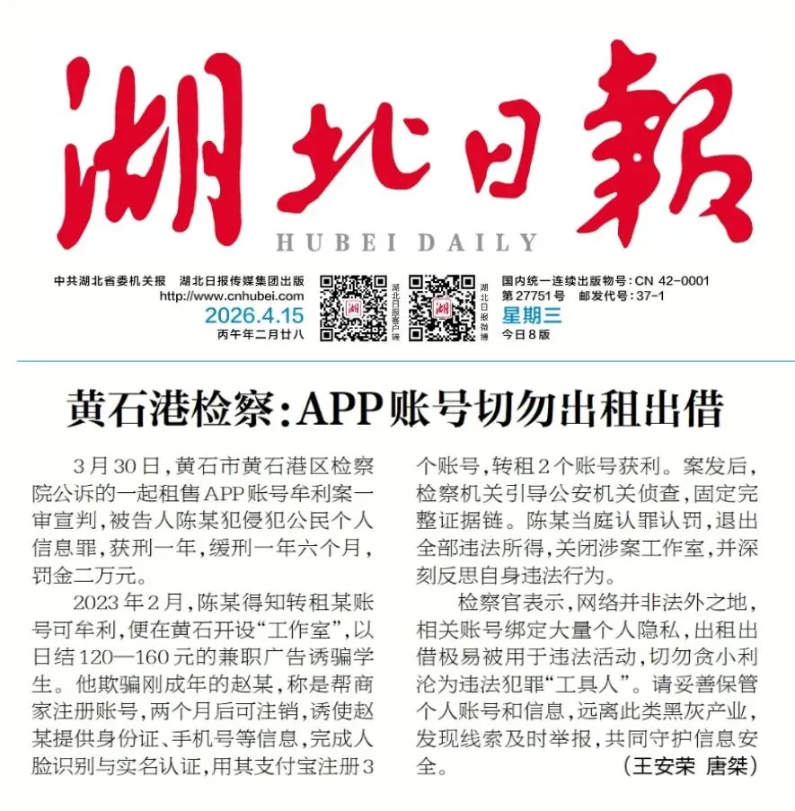 黄石港区检察院提醒:APP账号切勿出租出借