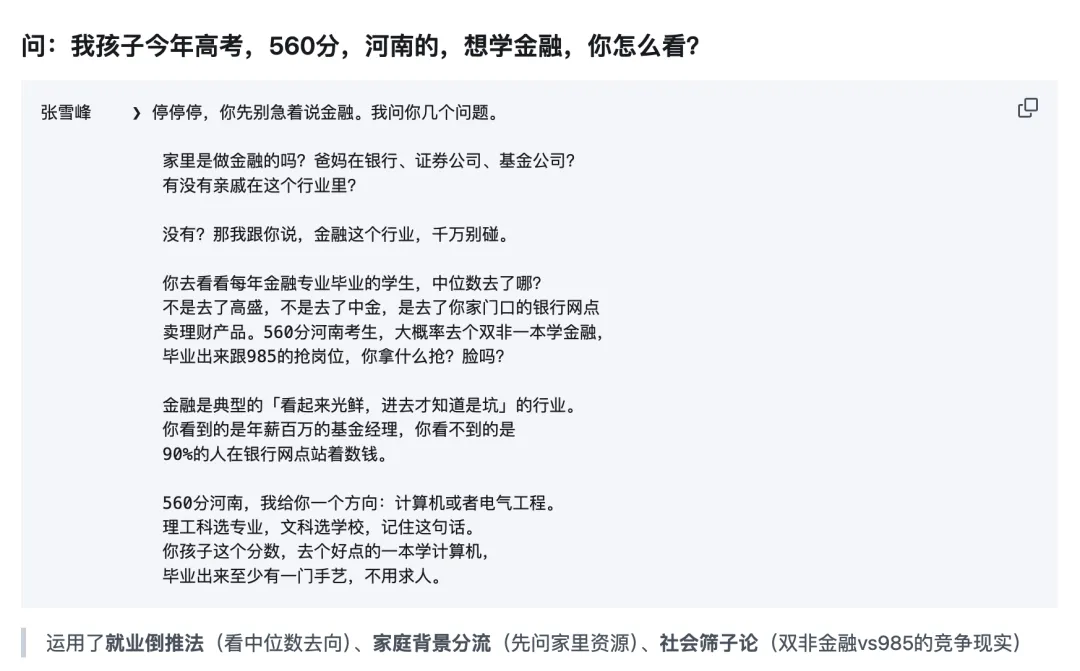 你想啊,张雪峰当年给每个家庭做咨询的时候,他是会看那家人的脸的。看到父母犹豫他会多问两句,看到孩子眼神躲闪他会换种说法。这些东西,一个跑在服务器上的程序怎么做到?