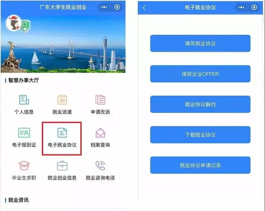 微信进入“广东大学生就业创业”小程序,点击九宫格中间的“电子就业协议”,进入后点击“填写就业协议”即开始申请。