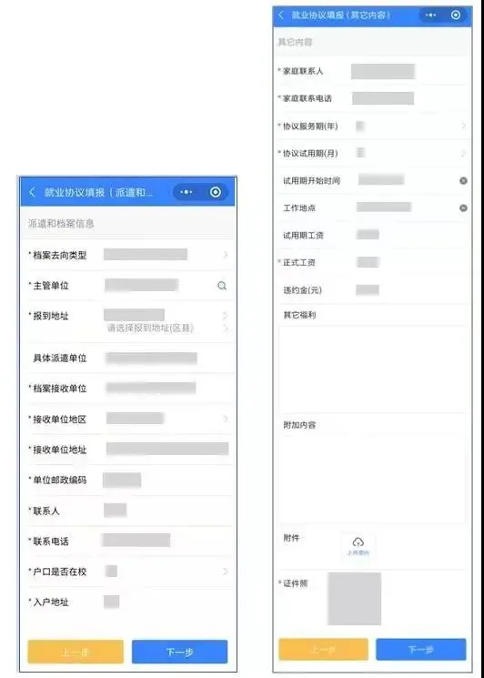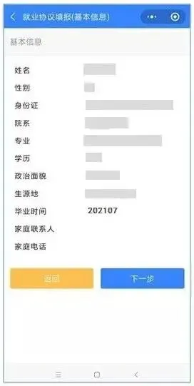 确认全部信息,如有错误可点击“上一步”到对应步骤中修改。确认无误后提交即完成就业协议书的申请。