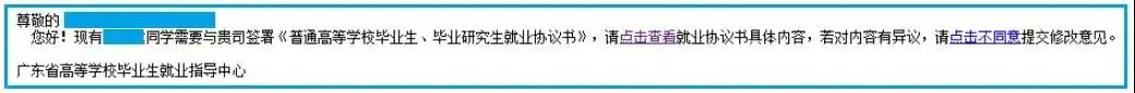 经院系和学校审核后,省就业系统将自动发送一封邮件到《电子协议书》到签约单位的邮箱(如果没有收到邮件请留意是否被转到垃圾箱)。签约单位若对内容有异议,请“点击不同意”提交修改内容,毕业生则可修改协议书内容。