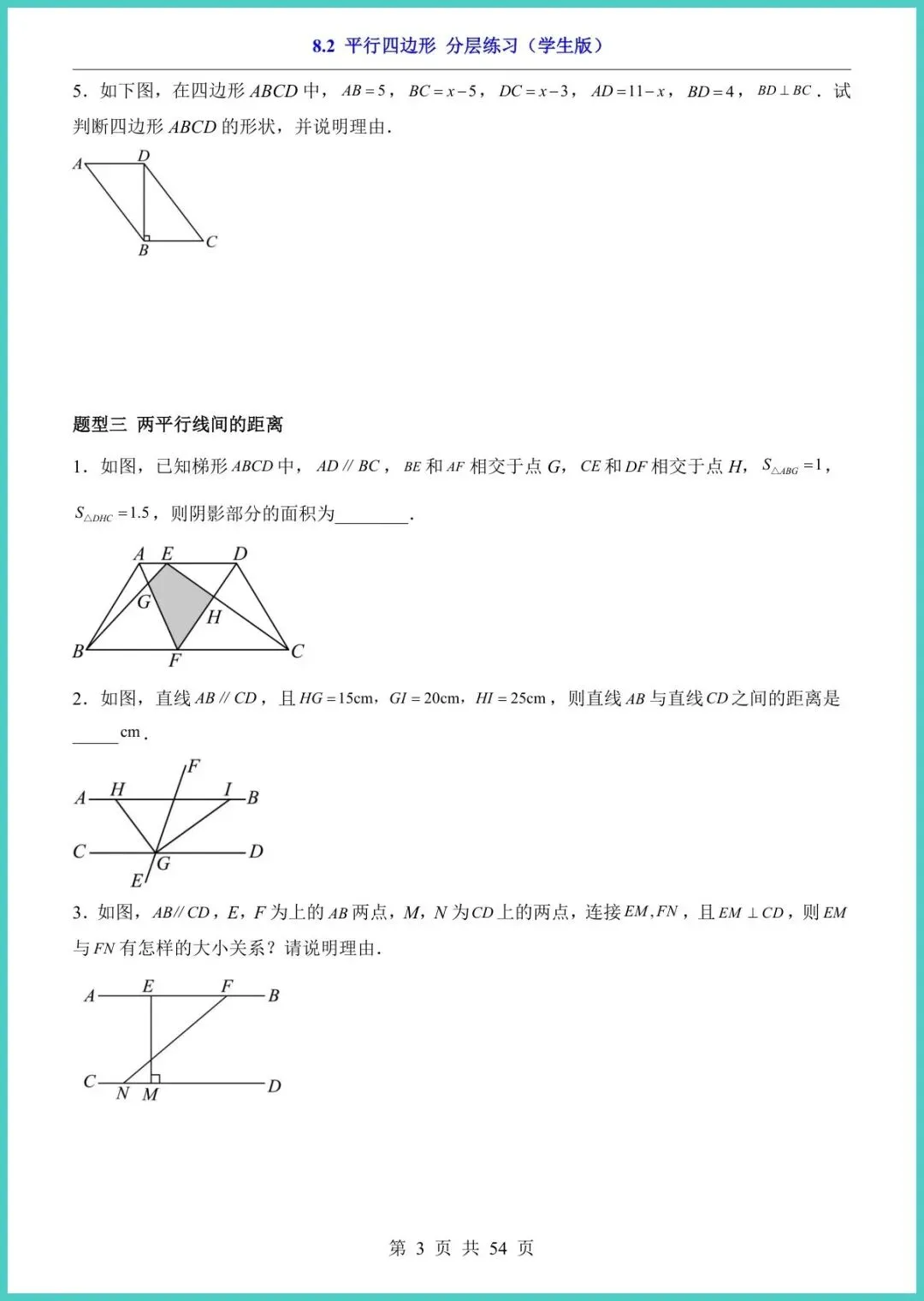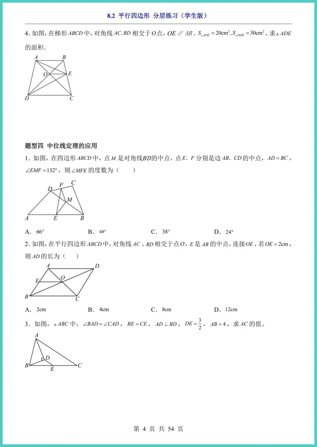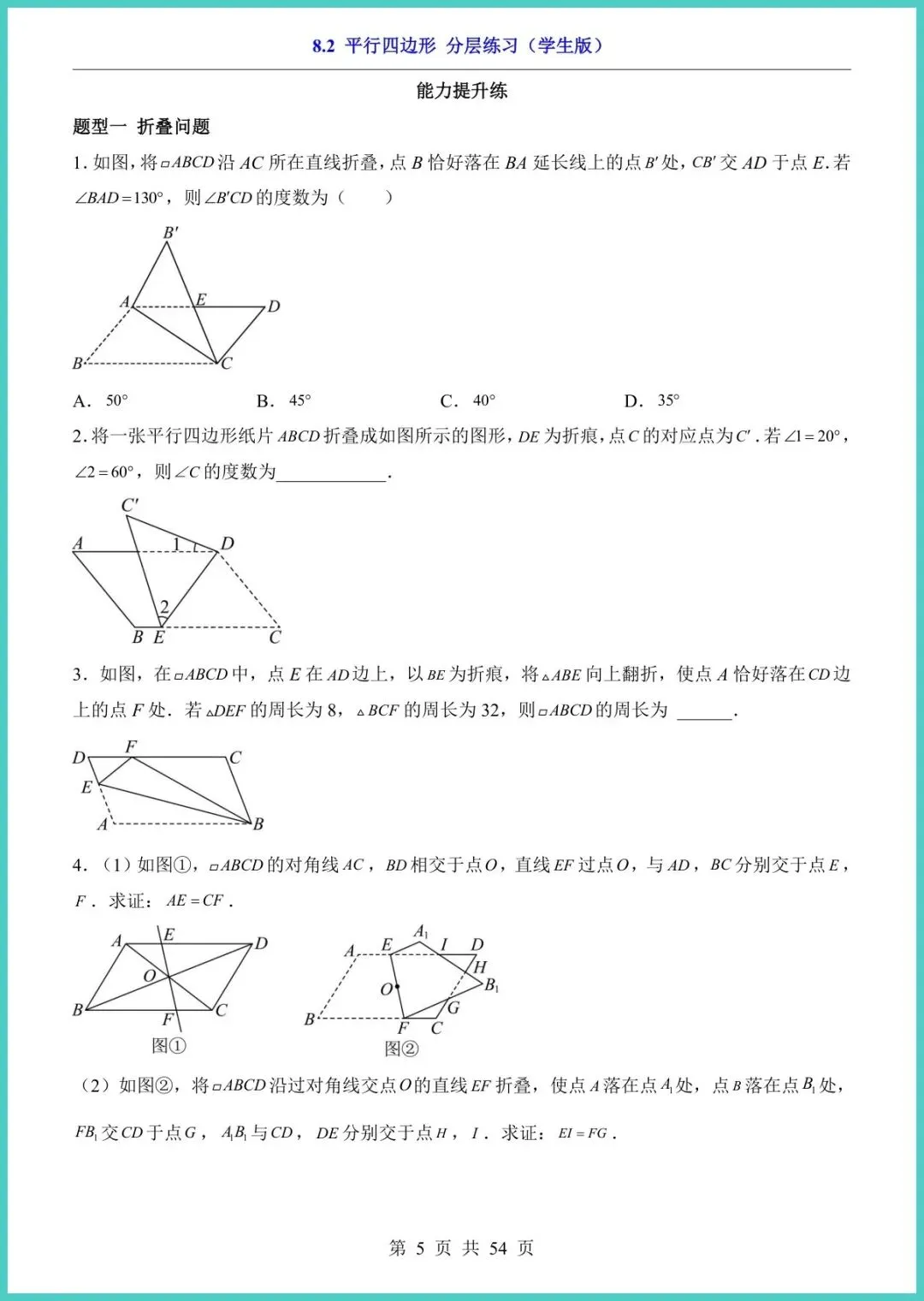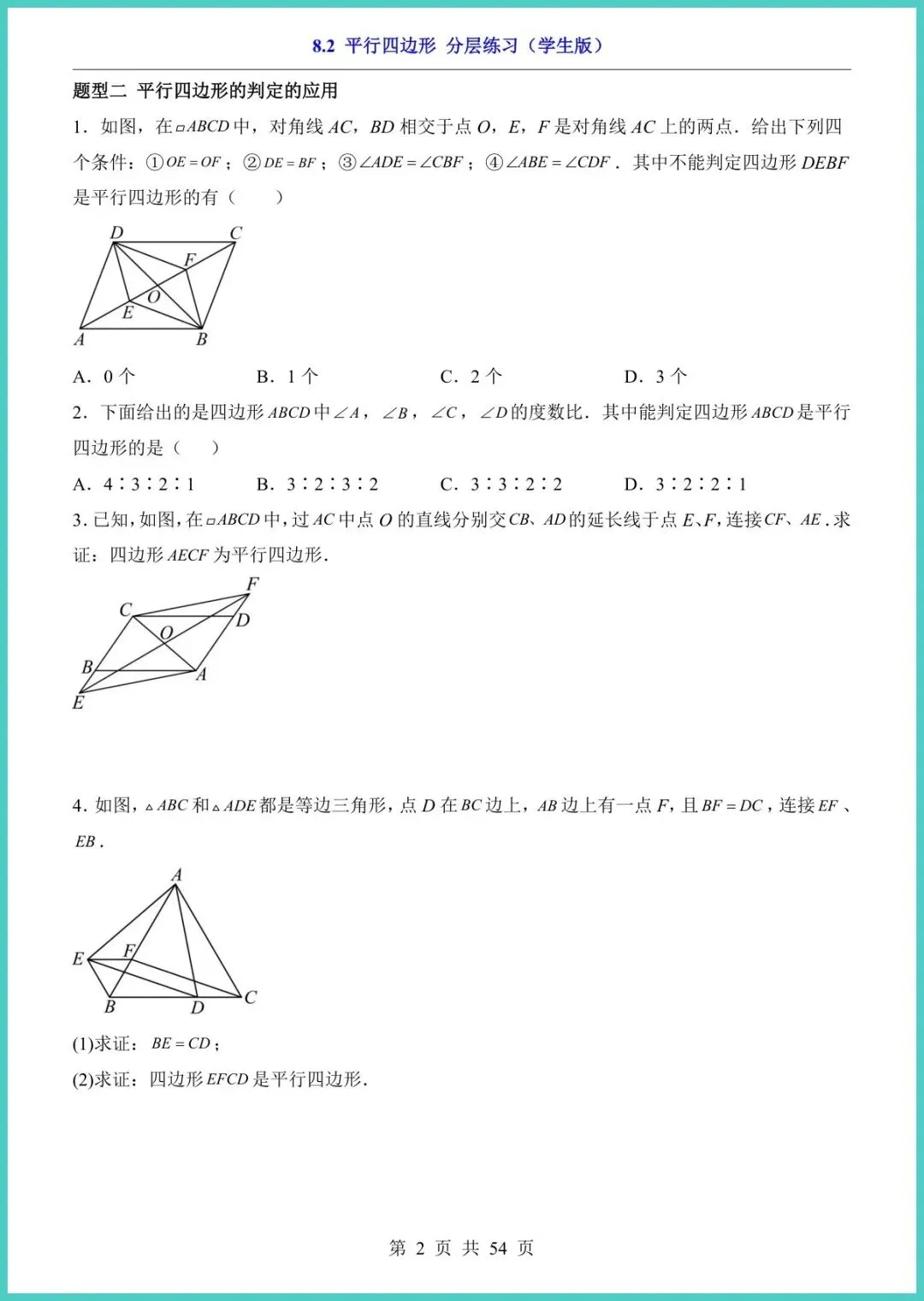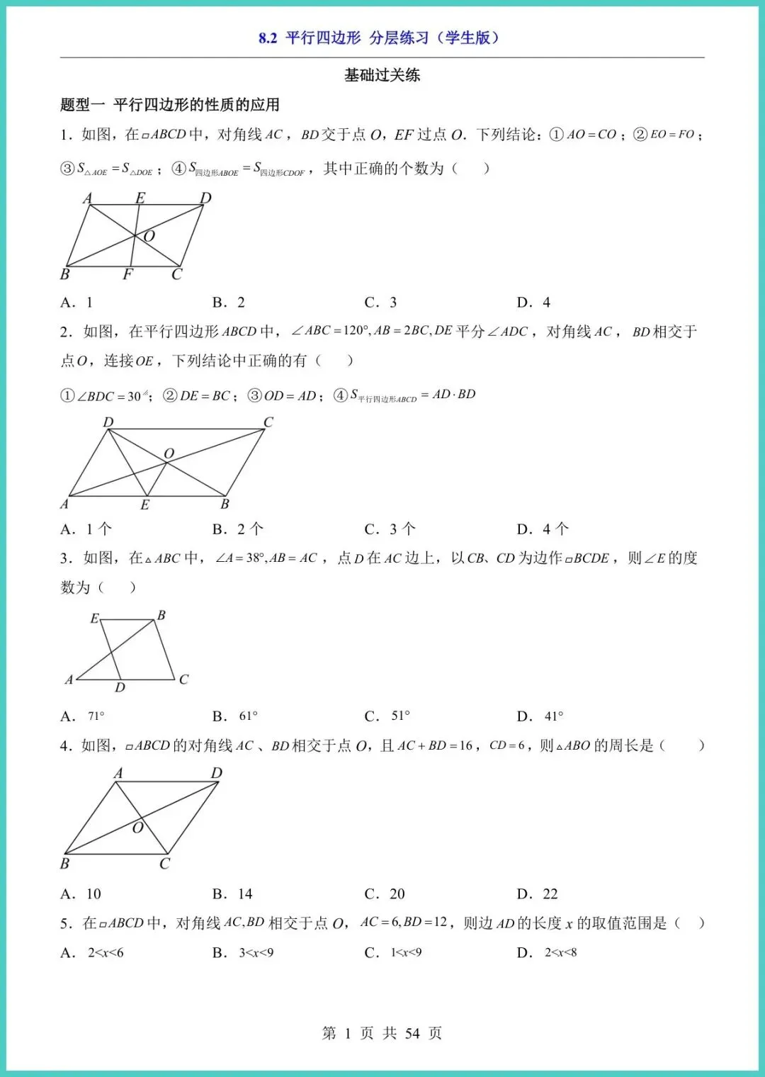 26年春青岛版八年级下册数学《8.2平行四边形分层练习》新鲜出炉,整整54页干货电子版,一键就能打!资料把“平行四边形”拆成基础闯关、能力提升、拓展拔高三阶梯:概念填空图形判定生活应用题易错陷阱,逐层升级,孩子先做“小试牛刀”稳信心,再冲“巅峰挑战”练思维,薄弱点、失分点一次扫清,几何逻辑悄悄长在身上!想让孩子期中多拿15分?现在就转存打印,今晚就能练!