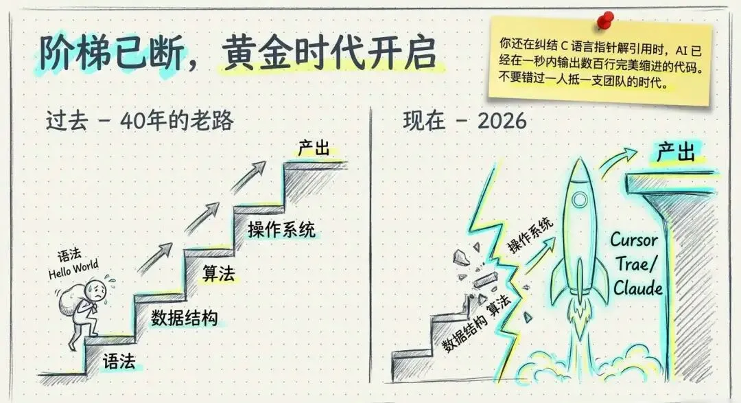 然而,2026 年的今天,这个阶梯被 AI 拦腰斩断。当 Cursor、Trae、Claude Code 能够以每秒数百行的速度输出完美缩进的代码时,作为 CS 专业的学生,如果你还在纠结一个 C 语言指针的解引用或是 Java 的繁琐配置,你可能正在错过一个“一人抵一支团队”的黄金时代。