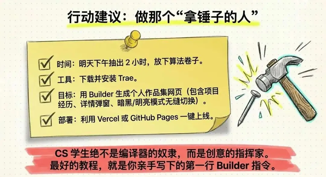 这篇文章想讲清一件事:在 AI 时代,CS 学生最核心的能力不再是“写出代码”,而是“定义产品”并“拆解需求”。 只要掌握了正确的心智模型和工具工作流(如国产 AI 编程软件 Trae),你完全可以跳过繁琐的底层语法泥潭,直接通过 AI 产出真实的网页、软件甚至是完整的商业原型。