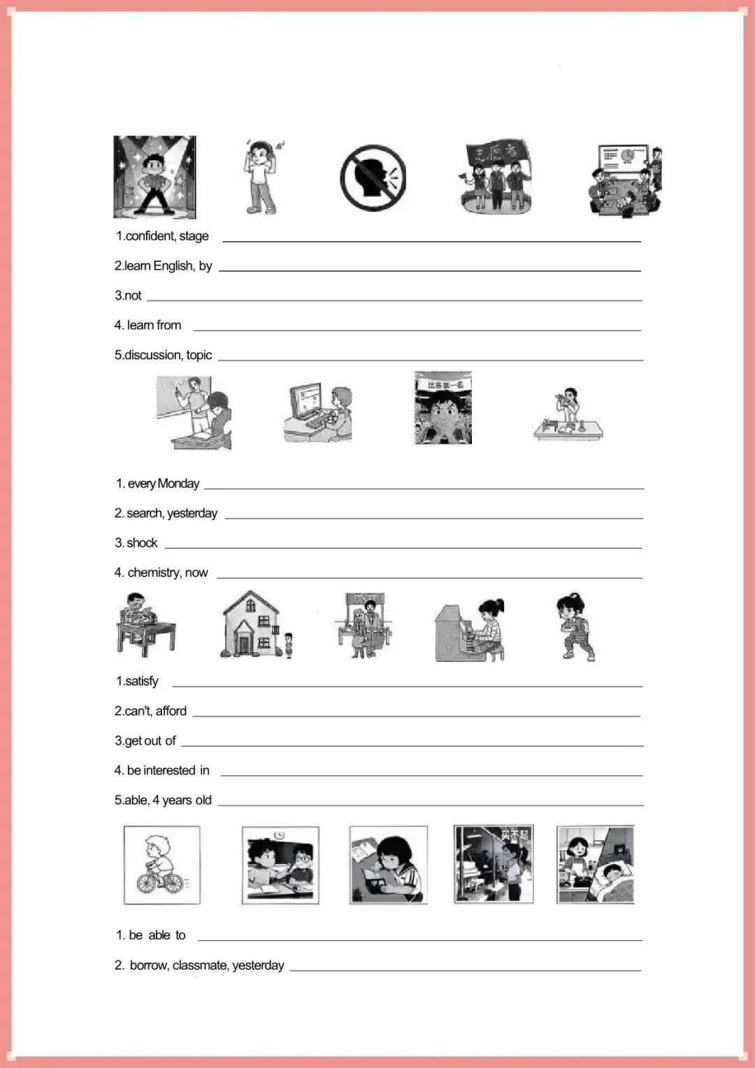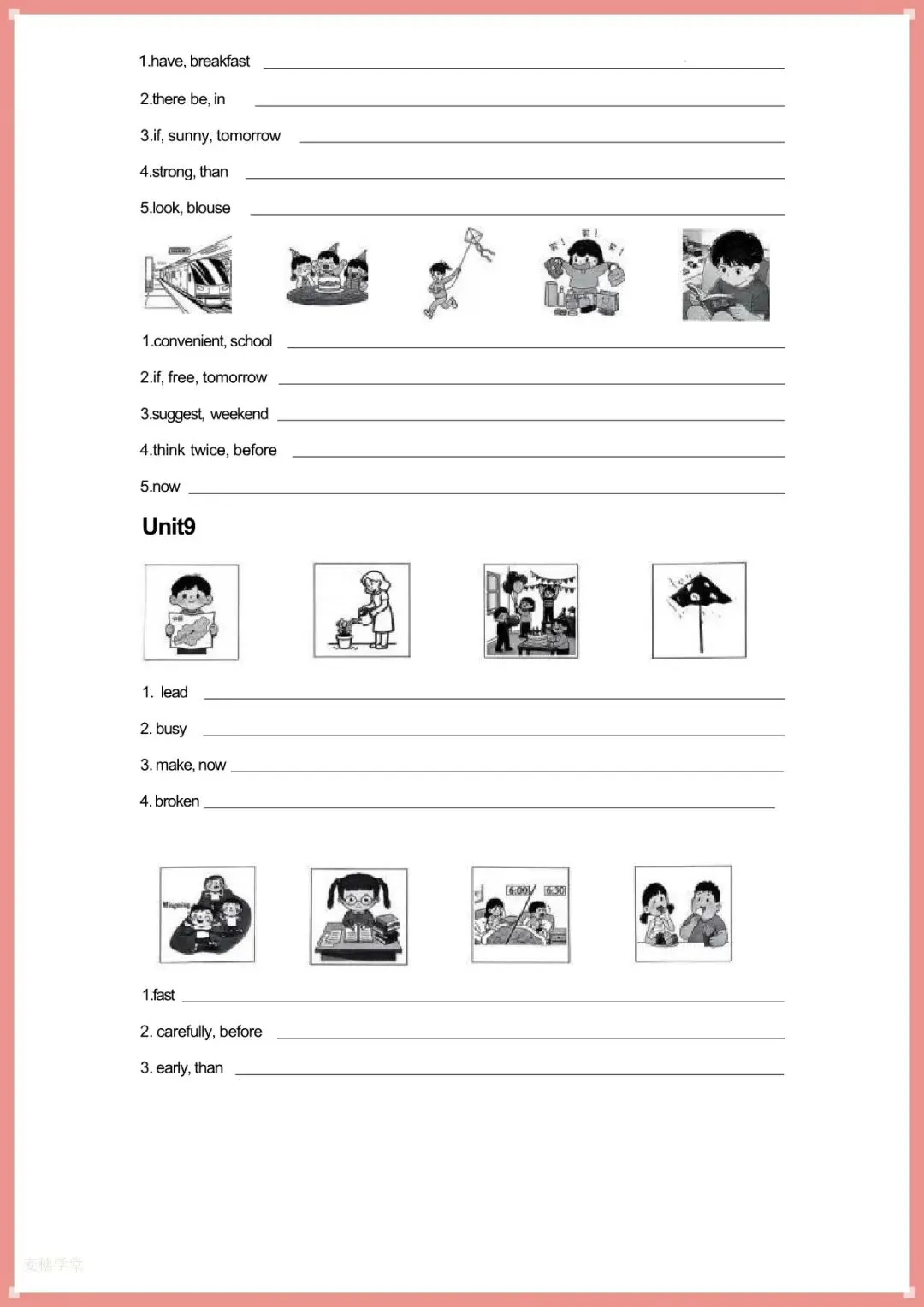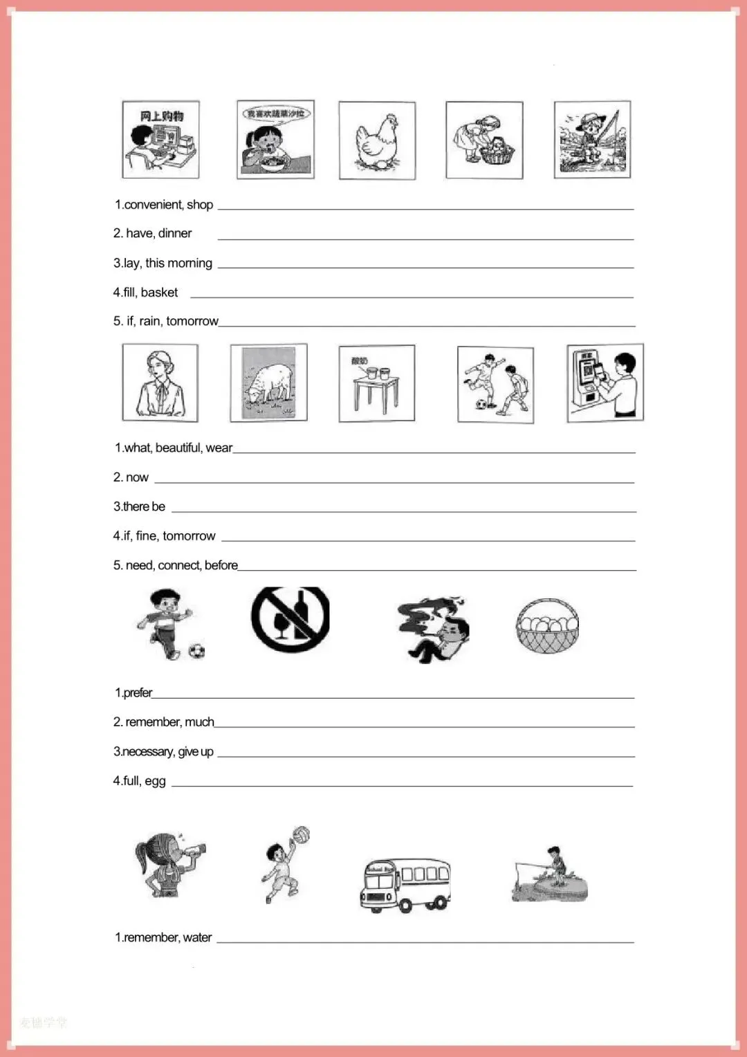 资料以词汇、句型、时态为主要内容,以日常生活场景为载体进行训练,重点考察一般现在时、一般过去时、一般将来时、现在进行时。Unit7 的主要教学内容为学习和生活的表达,常常考查borrow、afford、be able to、be interested in等短语,在课堂、阅读、卫生等方面的情境下进行连词成句的训练。第八单元主要涉及购物、饮食、日常生活等方面,并且会加强convenient、prefer、connect、if条件句等用法,与学校和生活实际相联系。Unit9 围绕安全、灾难、日常生活等方面展开,其中包括burn down、repair、prepare、earthquake等主题,并且会练习情态动词、比较级和被动语态的使用。