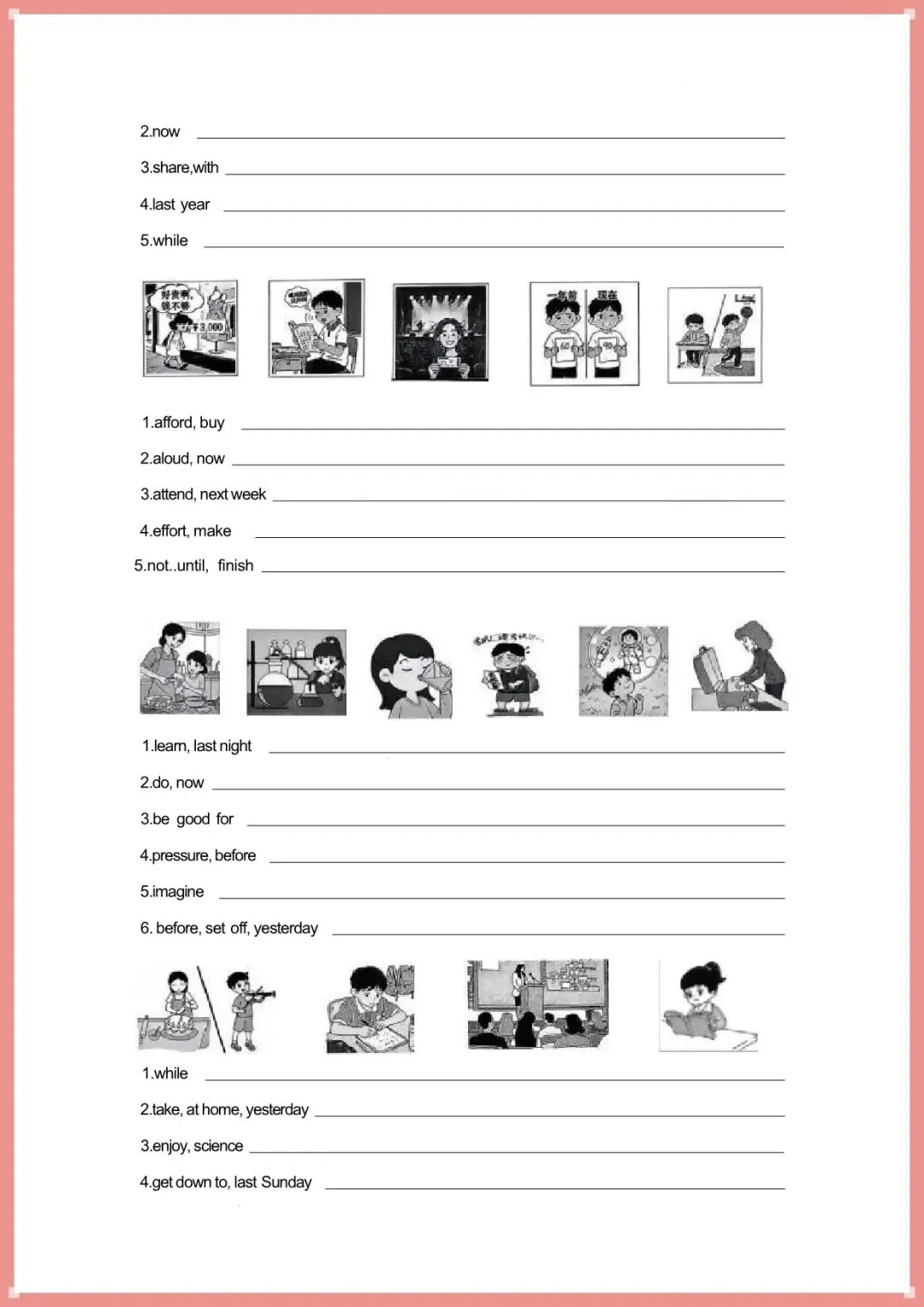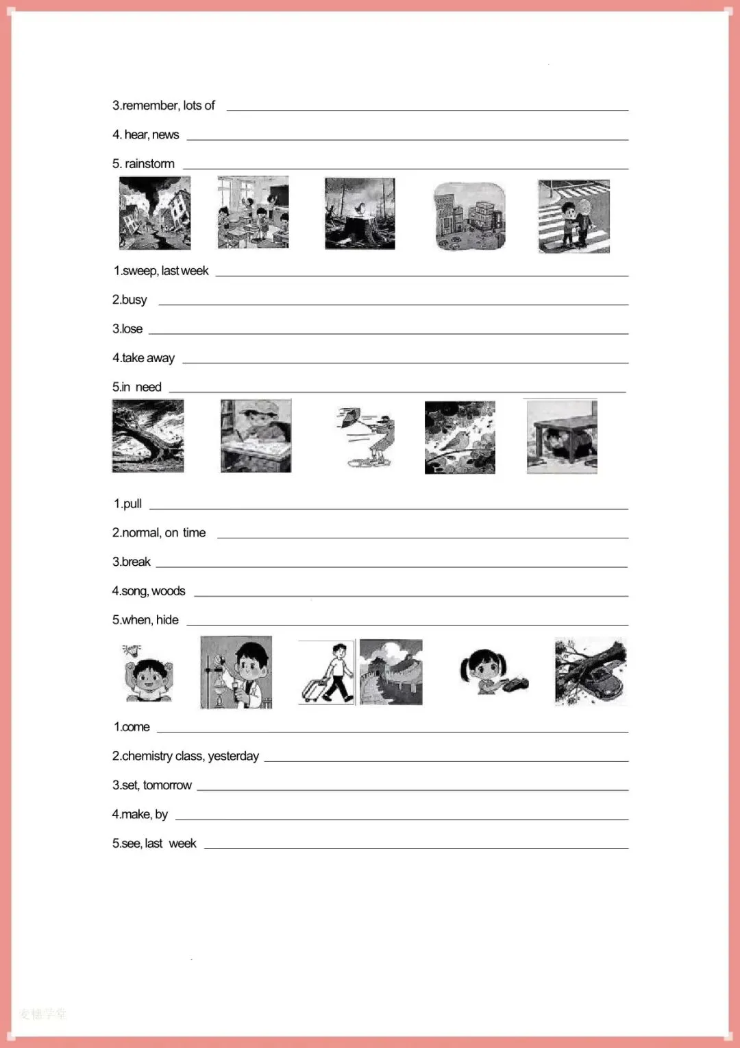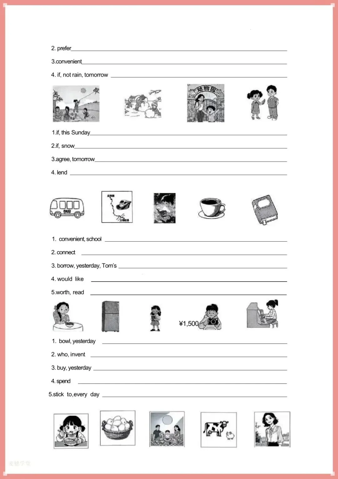 资料以词汇、句型、时态为主要内容,以日常生活场景为载体进行训练,重点考察一般现在时、一般过去时、一般将来时、现在进行时。Unit7 的主要教学内容为学习和生活的表达,常常考查borrow、afford、be able to、be interested in等短语,在课堂、阅读、卫生等方面的情境下进行连词成句的训练。第八单元主要涉及购物、饮食、日常生活等方面,并且会加强convenient、prefer、connect、if条件句等用法,与学校和生活实际相联系。Unit9 围绕安全、灾难、日常生活等方面展开,其中包括burn down、repair、prepare、earthquake等主题,并且会练习情态动词、比较级和被动语态的使用。