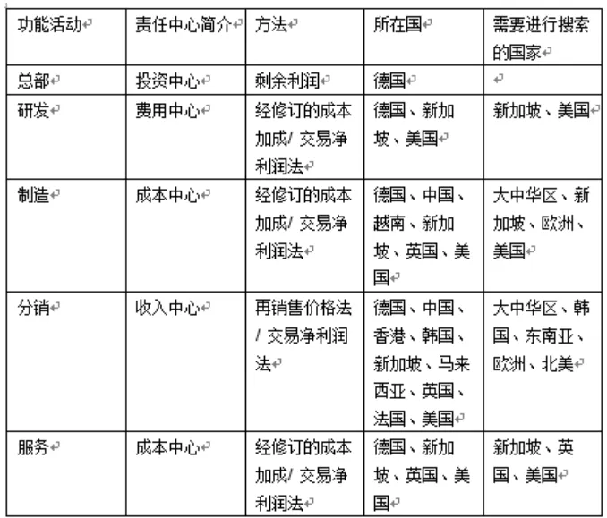 功能分析关注的是每一个主要商业活动,即研究开发、制造、分销和服务,并识别其执行的主要功能、承担的风险、以及集团完成以上商业活动时所使用的有形和无形资产。主体文档方法对集中化商业模式最具效果,因为该模式下不同税收管辖区的制造公司的商业行为大体相似。