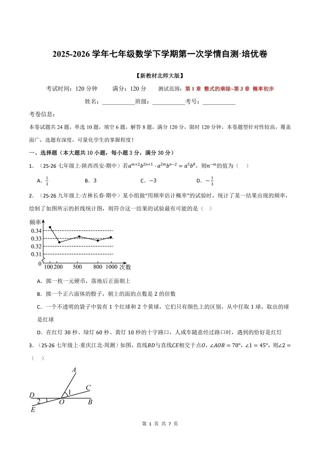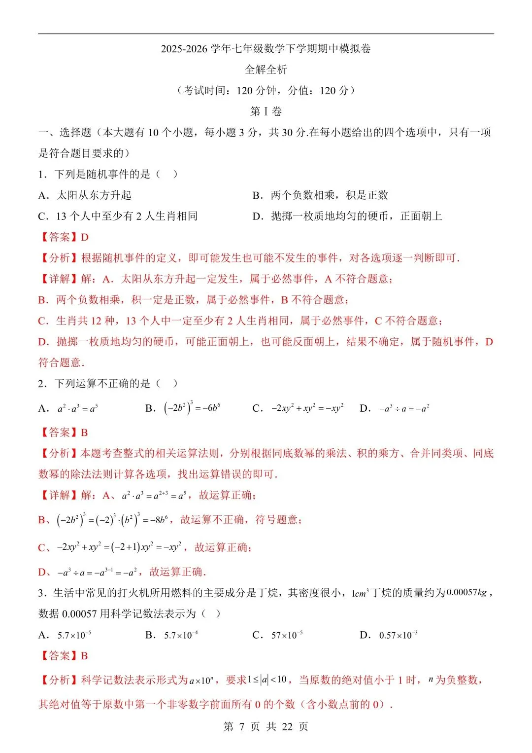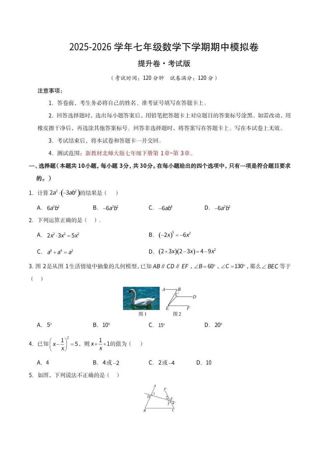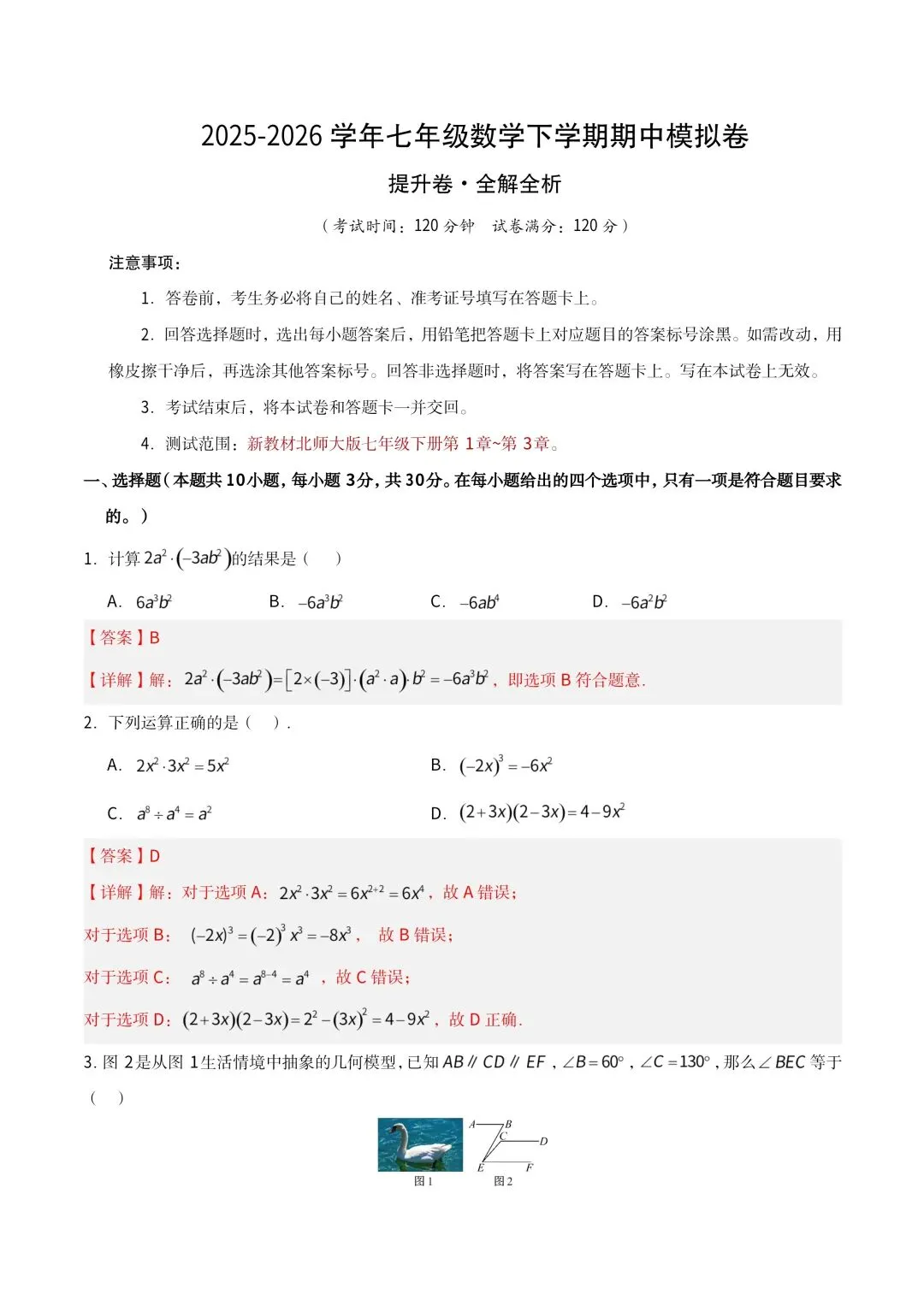 期中试卷|2026年北师大版七年级下册数学期中真题模拟测试卷(6套含答案)电子版可打印。