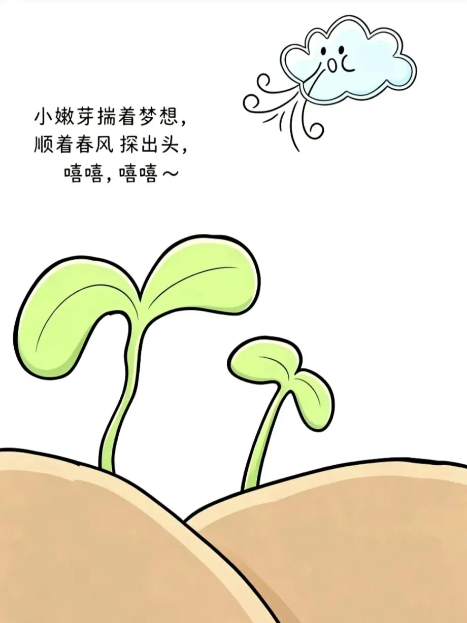 泥土里的小嫩芽怀揣着对世界的好奇,顺着温柔的春风,一点点探出嫩黄的小脑袋,睁大眼睛打量着崭新的世界,嘻嘻,嘻嘻,每一片嫩芽都在努力生长,向着阳光的方向慢慢舒展。