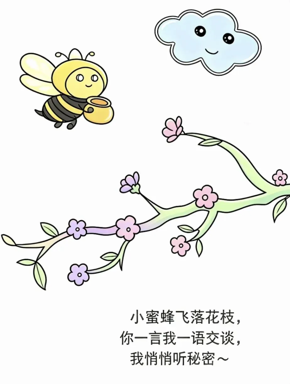 勤劳的小蜜蜂嗡嗡地飞落花枝,落在香甜的花蕊上,和朵朵小花亲密交谈,分享着春日的美好与甜蜜,小朋友悄悄凑近,就能听见它们之间藏不住的春日小秘密。