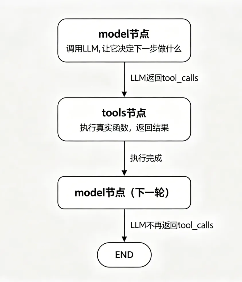 第1轮: messages = [HumanMessage("北京天气怎么样?")] → model 输出 AIMessage(tool_calls=[...]) → tools 输出 ToolMessage(...) → messages = [Human, AIMessage, ToolMessage]第2轮: → model 输入 [Human, AIMessage, ToolMessage] → LLM 看到工具已执行,直接输出最终回答 → 没有 tool_calls → 结束