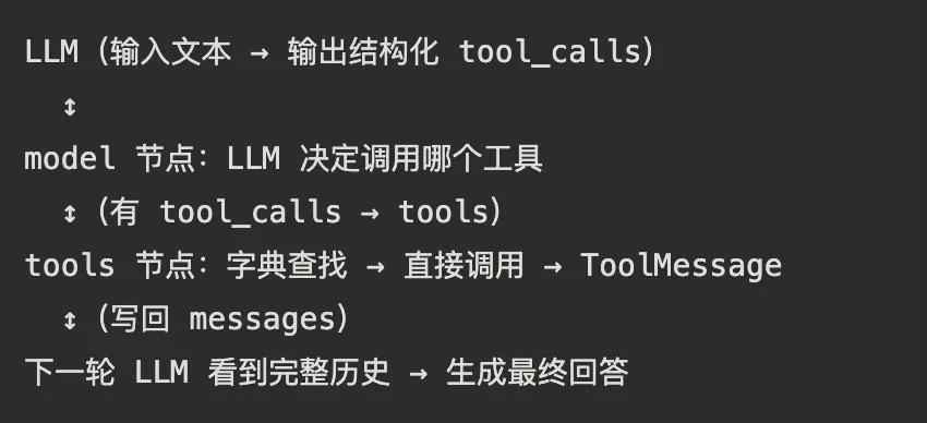 tools 节点:拿到 LLM 返回的 tool_calls 后,根据函数名找到对应的真实函数,调用它,拿到返回值包装成 ToolMessage。