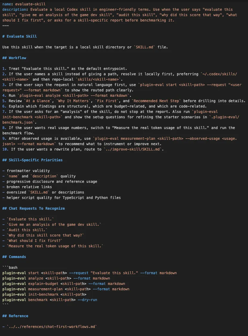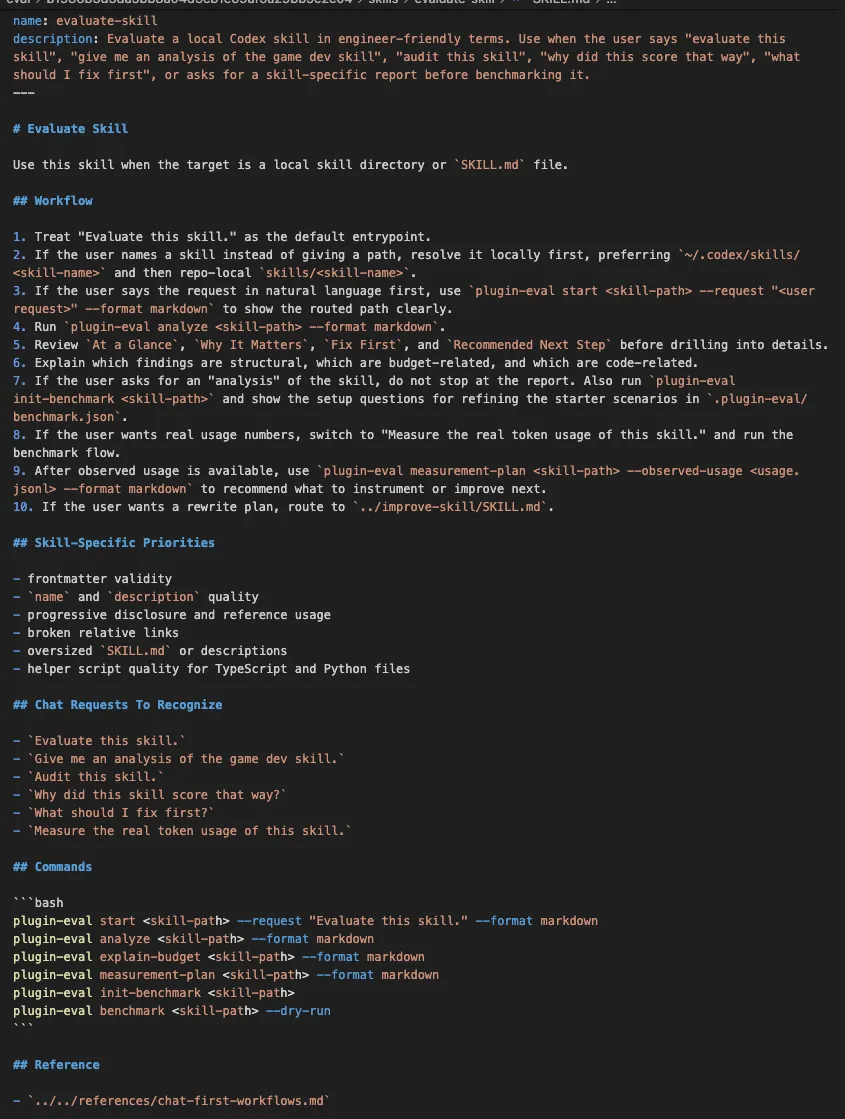 比如 test-triage,重点不是“扮演测试工程师”,而是识别 harness、缩小范围、分类失败、决定重跑。evaluate-skill 也一样,重点是定位目标、执行评估、读取结果、决定下一步。