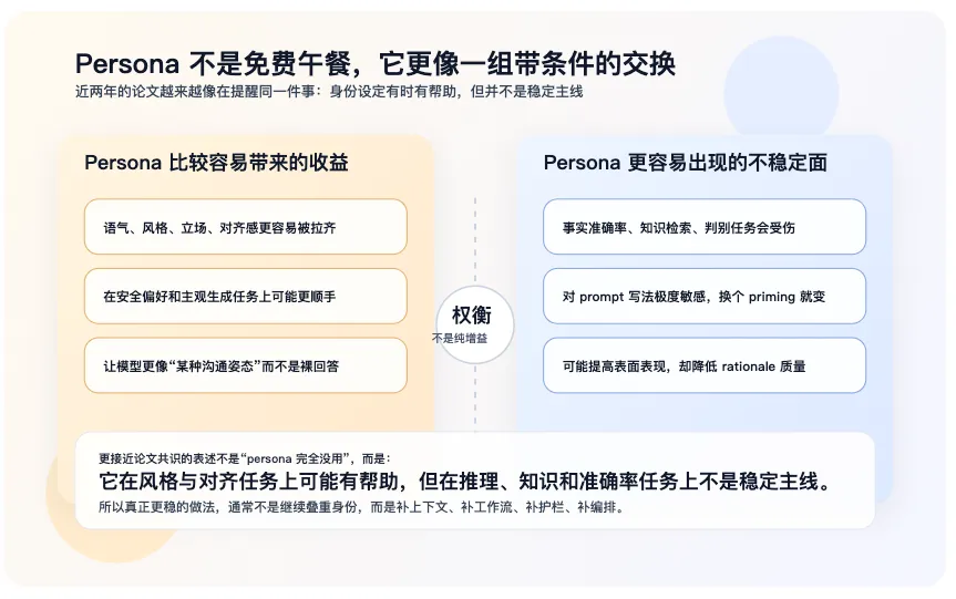 如果这只是工程直觉,还不够。我后来顺着“重身份设定是不是负优化”去翻论文,发现近两三年的结论也很一致:persona prompting 不是稳定、普适、无副作用的增强手段。