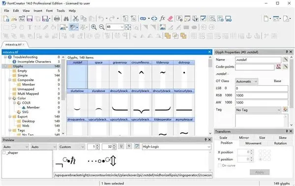 软件支持完整OpenType编辑、调试与格式转换,可优化轮廓、修正字符映射、批量生成复合字形,支持垂直指标与全编码格式,还能预览、安装字体,字体修改与修复能力十分全面。