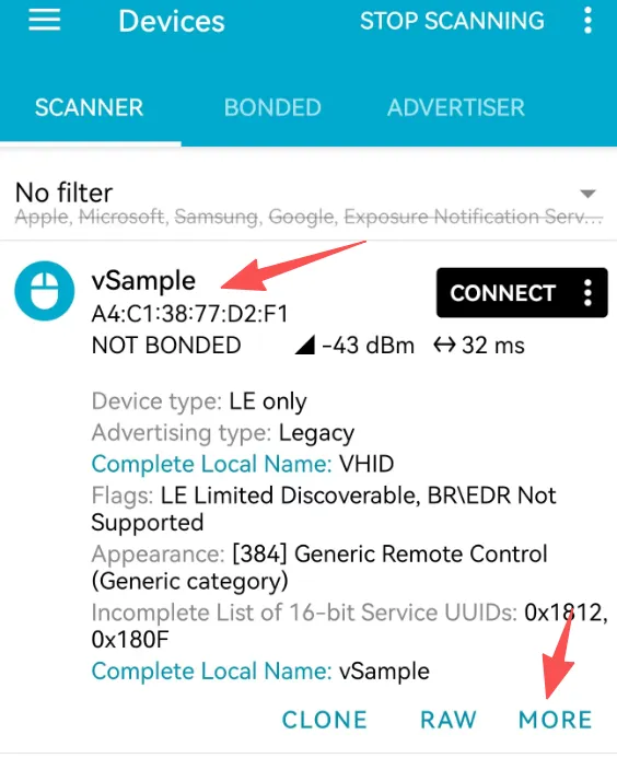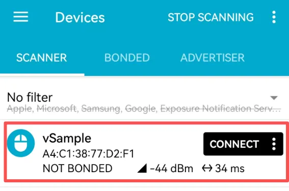 2.1、打开nRF Connect软件进行搜索,vSample的代表是当前的广播