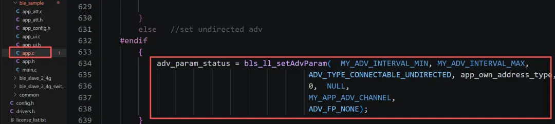 如上图所示,广播间隔的参数是在app.c中的bls_ll_setAdvParam这个函数中,其中的MY_ADV_INTERVAL_MIN和MY_ADV_INTERVAL_MAX分别代表了广播的最大小间隔和最大的间隔。