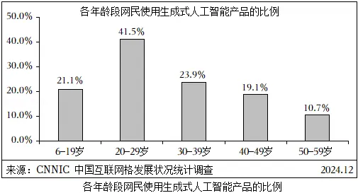 ③从年龄来看,20—29岁网民使用生成式人工智能产品的比例最高,达到41.5%;其次为30—39岁网民,比例为23.9%;6—9岁网民也达到21.1%。由此可见,。