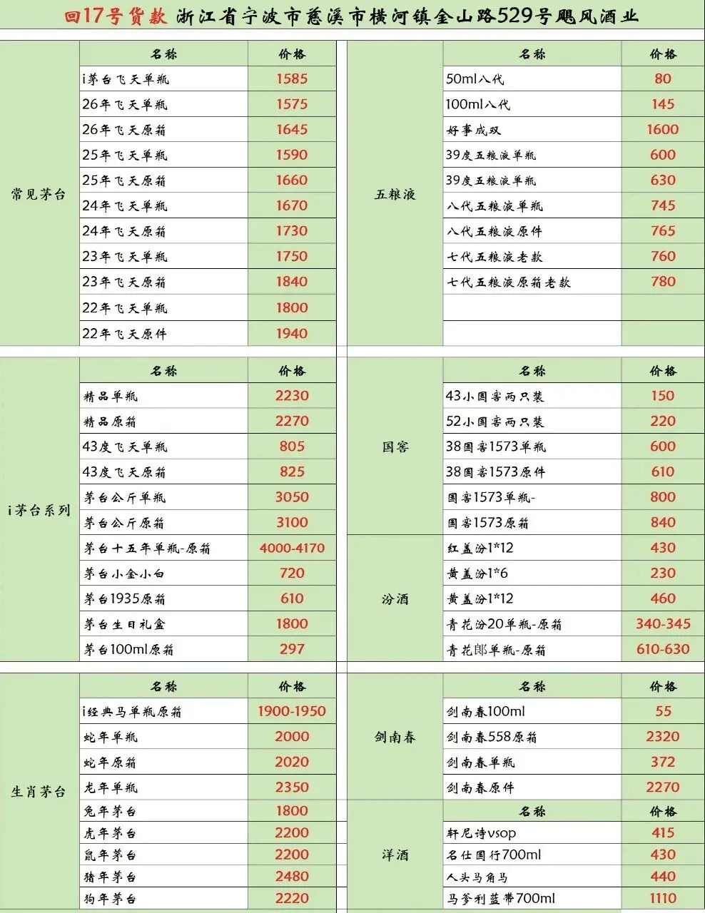 茅台酒水地址:浙江省宁波市慈溪市横河镇金山路529号