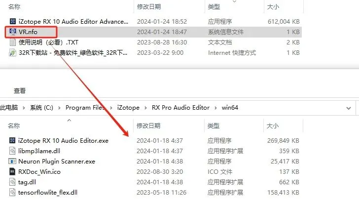 5、此时,将“VR.nfo”文件复制到软件安装目录中进行替换即可默认路径为【C:\Program Files\iZotope\RX Pro Audio Editor\win64】。