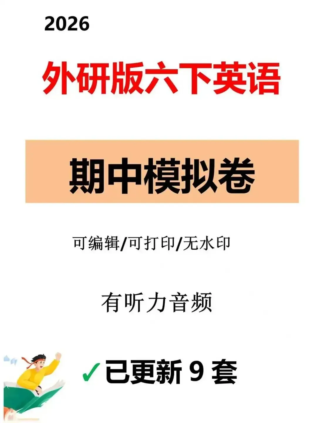 2026春外研版小学六年级下册英语期中冲刺,9套全真测试卷精准适配!配套完整听力答案、听力原文及笔试参考答案,覆盖校内期中全部考点,兼顾基础巩固、难点突破与应试演练,助力六年级学生高效刷题、查漏补缺,平稳衔接初中英语,从容拿下期中好成绩。