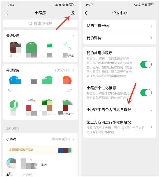 1、在手机微信中点击“发现 – 小程序”,然后点击右上角的“小头像”图标,并点击“小程序中的个人信息与权限”,就可以看到自己微信都授权了哪些小程序。